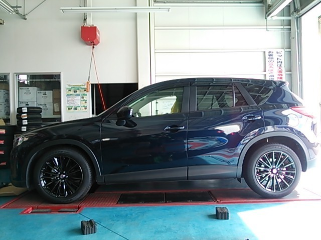 本日はいつも遠方よりご来店頂いておりますお客様のCX-5に、アルミホイールの交換と、テインの車高調を依頼頂きました。ホイールはレイズの「ベルサス ストラテジーア クラフトコレクション ヴォウジェ ブラックディアマンテ(ながっ!!)」じつはこちらのホイール、特注カラーということもあるんですが、1月中旬にオーダーして5/7にやっと入荷致しました(当初予定は5/末でした!)。大変長い間お待たせいたしました(汗)。(レイズのホイールは、納期のかかるモノも多くありますので、検討中の方は早めのご相談お待ちしています。)