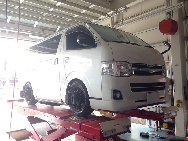 ハイエースはショックをクスコのツーリングAに替えられてのアライメント調整です。