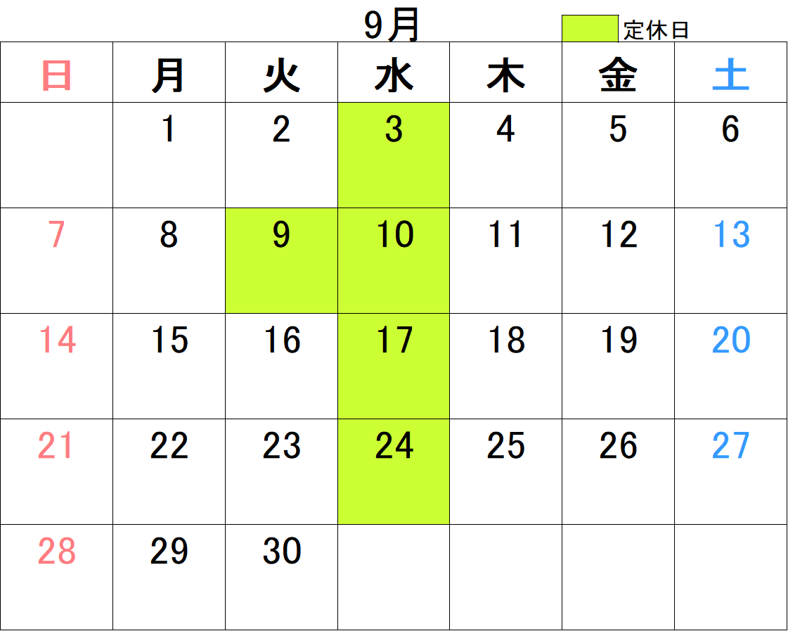 9月定休日のお知らせ
