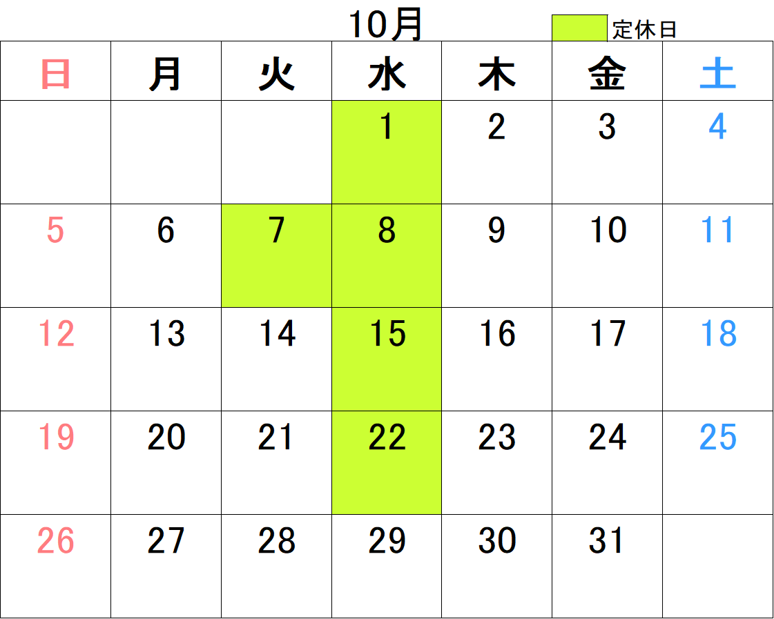 10月の定休日のお知らせ