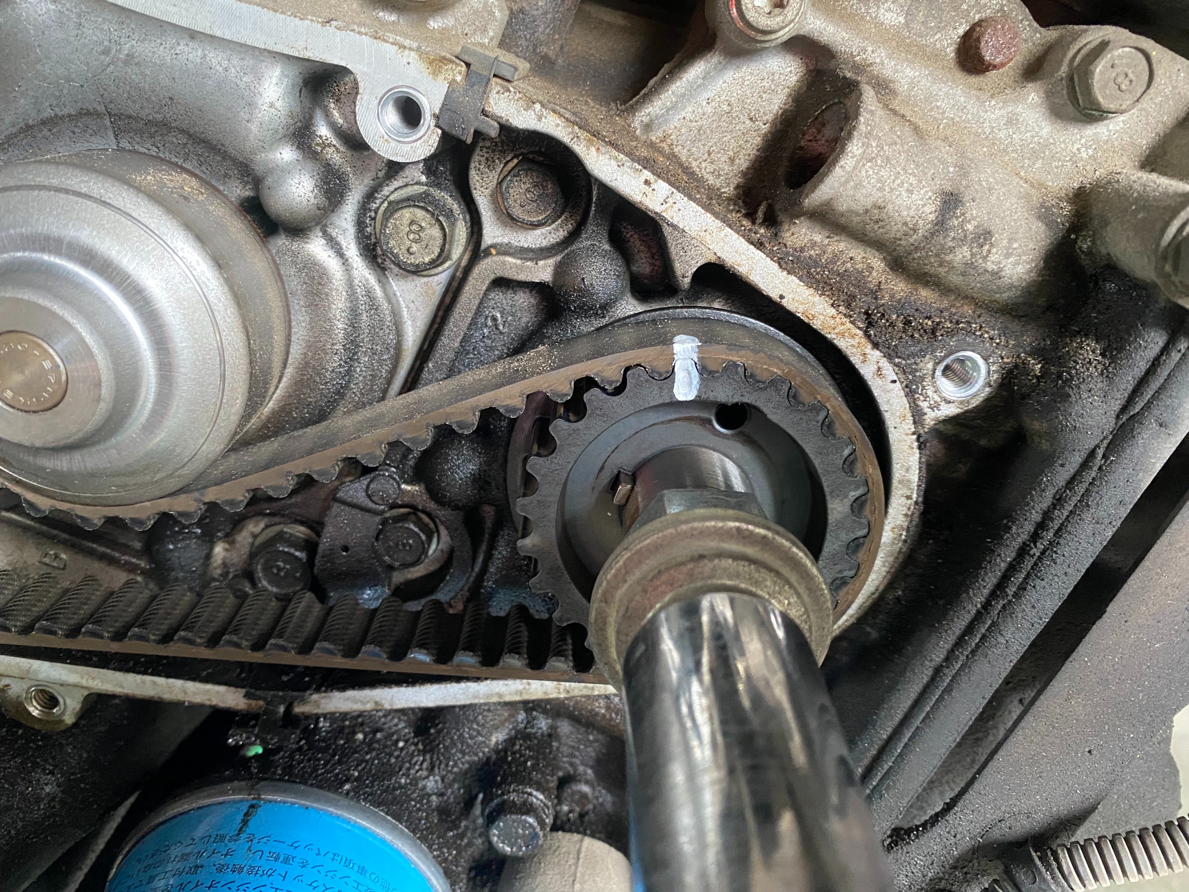 ↑合わせマークを合わせてテンショナーとタイミングベルト、スプロケットを外した状態