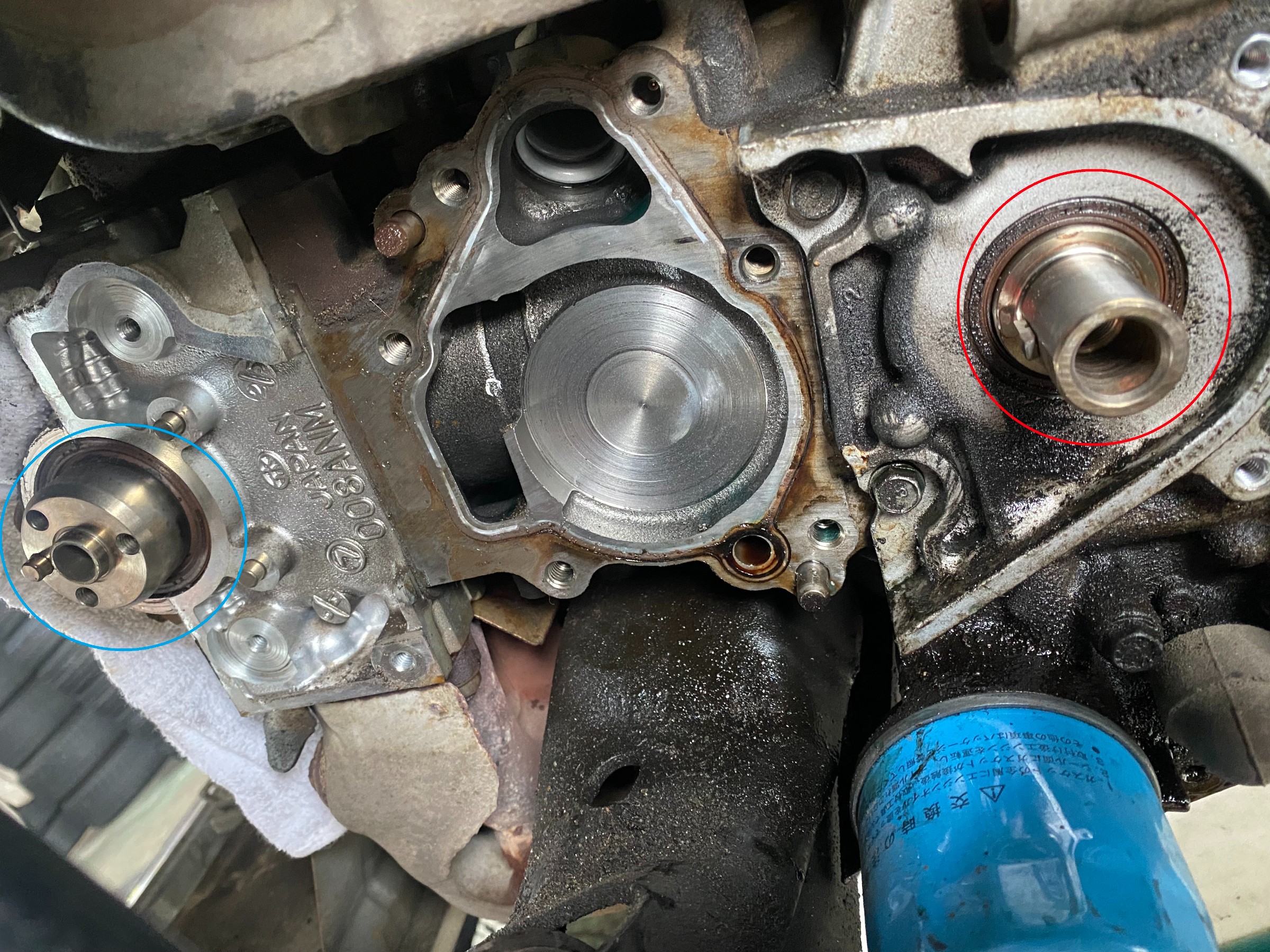 青丸がカムシャフト(オイルシール)