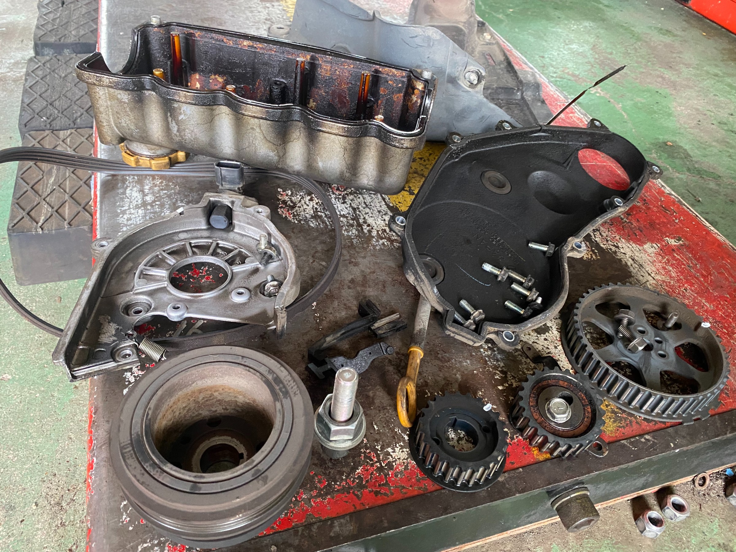 ↑クランクプーリーを外し、タイミングカバーを外した状態