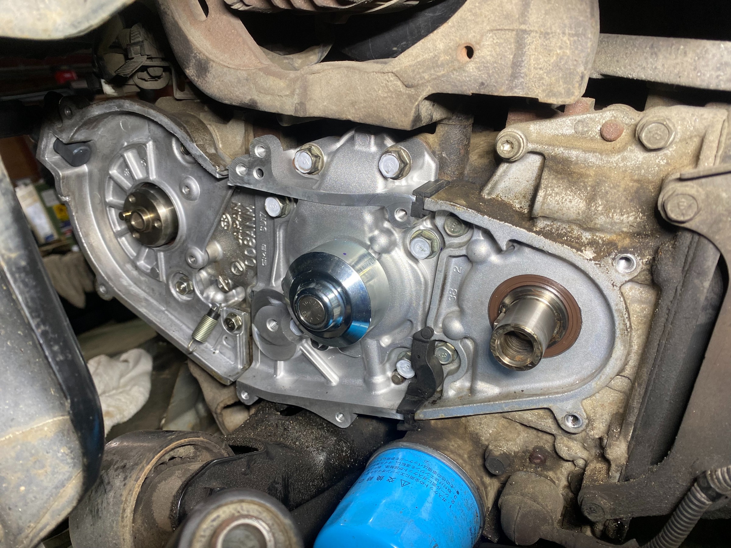 ↑新品ウォータポンプとオイルシール取り付け
