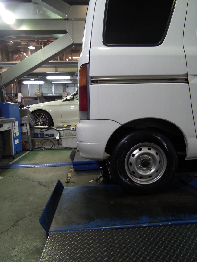 そのタイヤ交換車両の奥に、メルセデスS222が作業待ち。