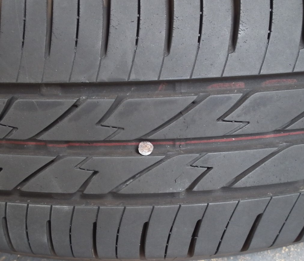 タイヤのトレッド部の真ん中に、ビスが刺さっています。