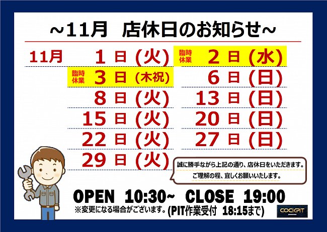 【11月 店休日のお知らせ】 1日(火)・ 2日(水)・3日...
