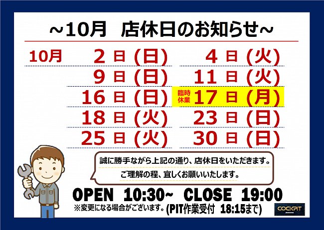 【10月 店休日のお知らせ】 2日(日)・ 4日(火)