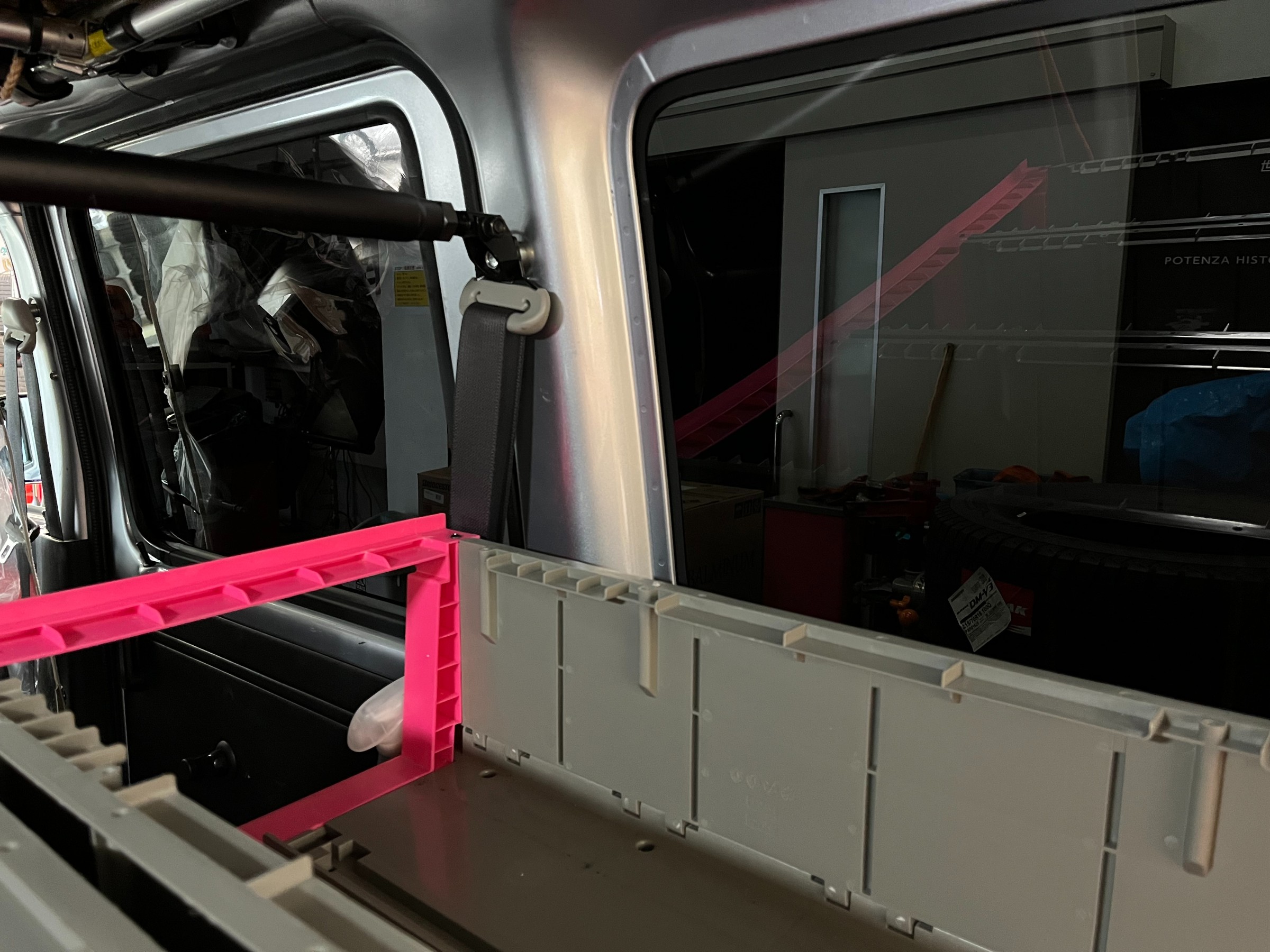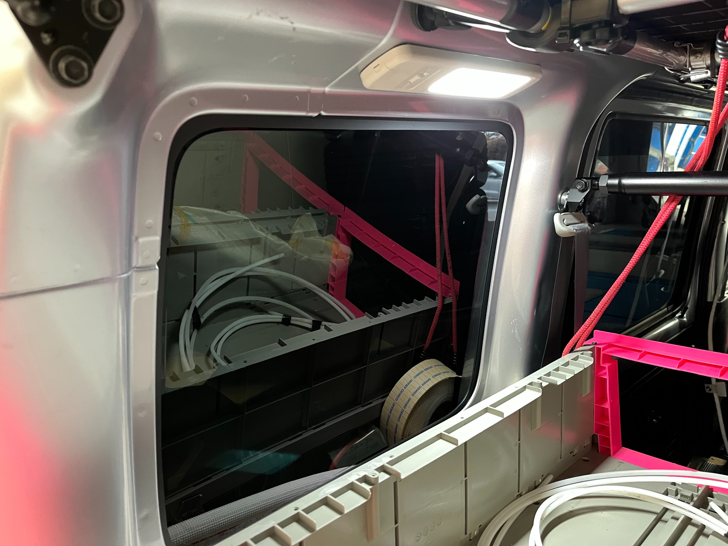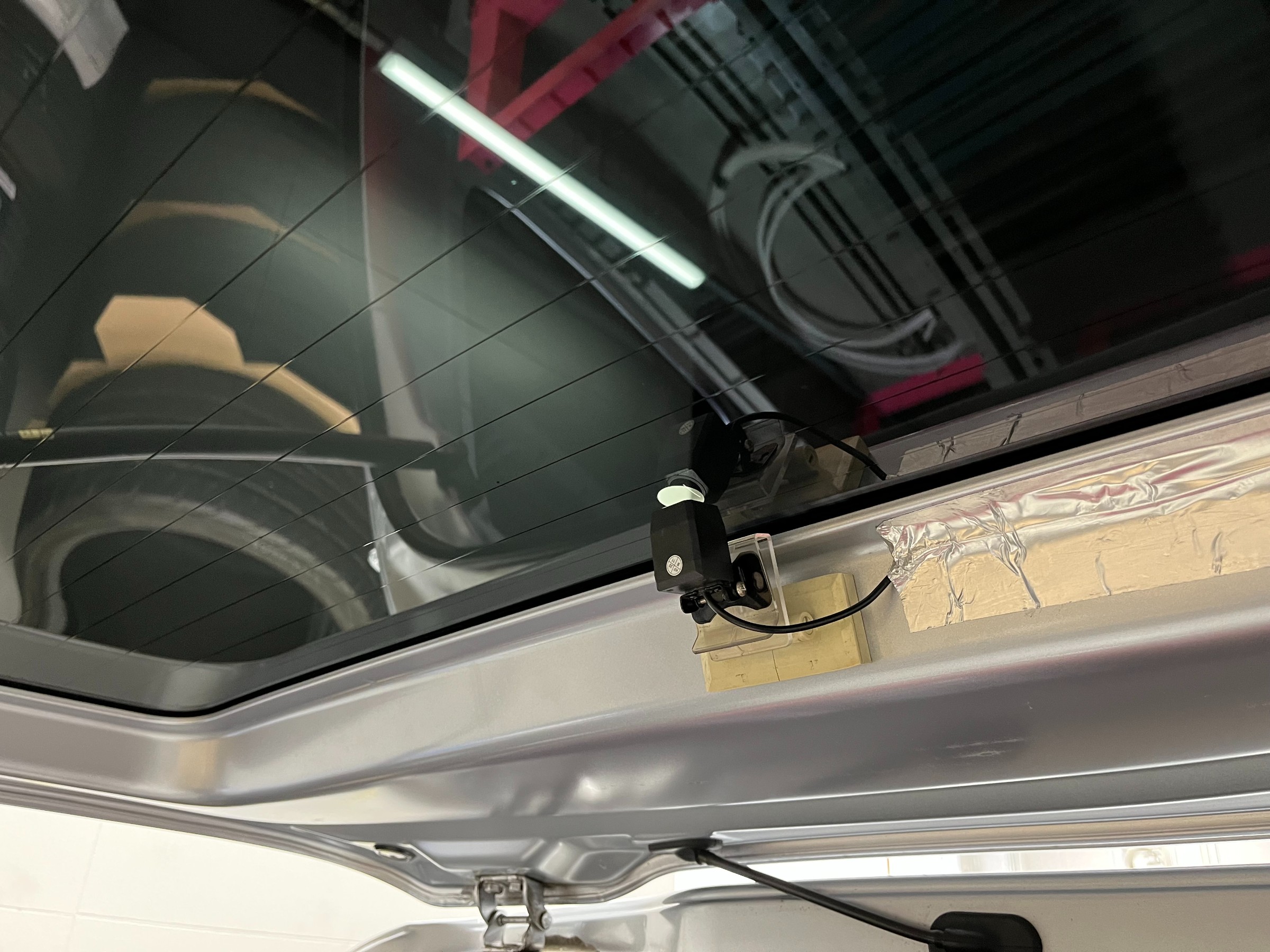 オーナー様ご自身で取付しているリアモニター用カメラ部分を円状にくり抜いて頂きました。