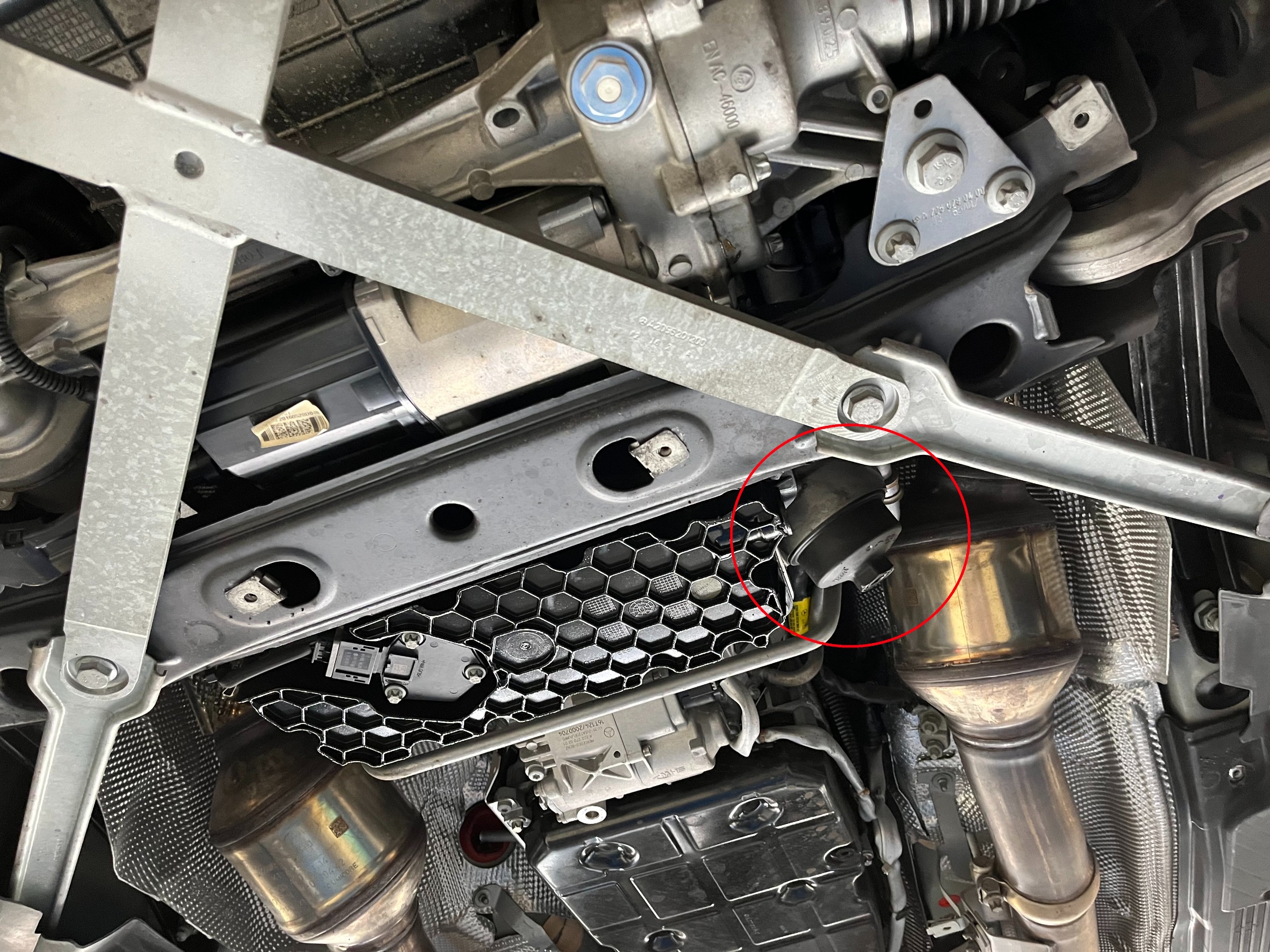 オイルドレン・フィルターは赤丸のところに、ドレンはオイルパン横に位置します。