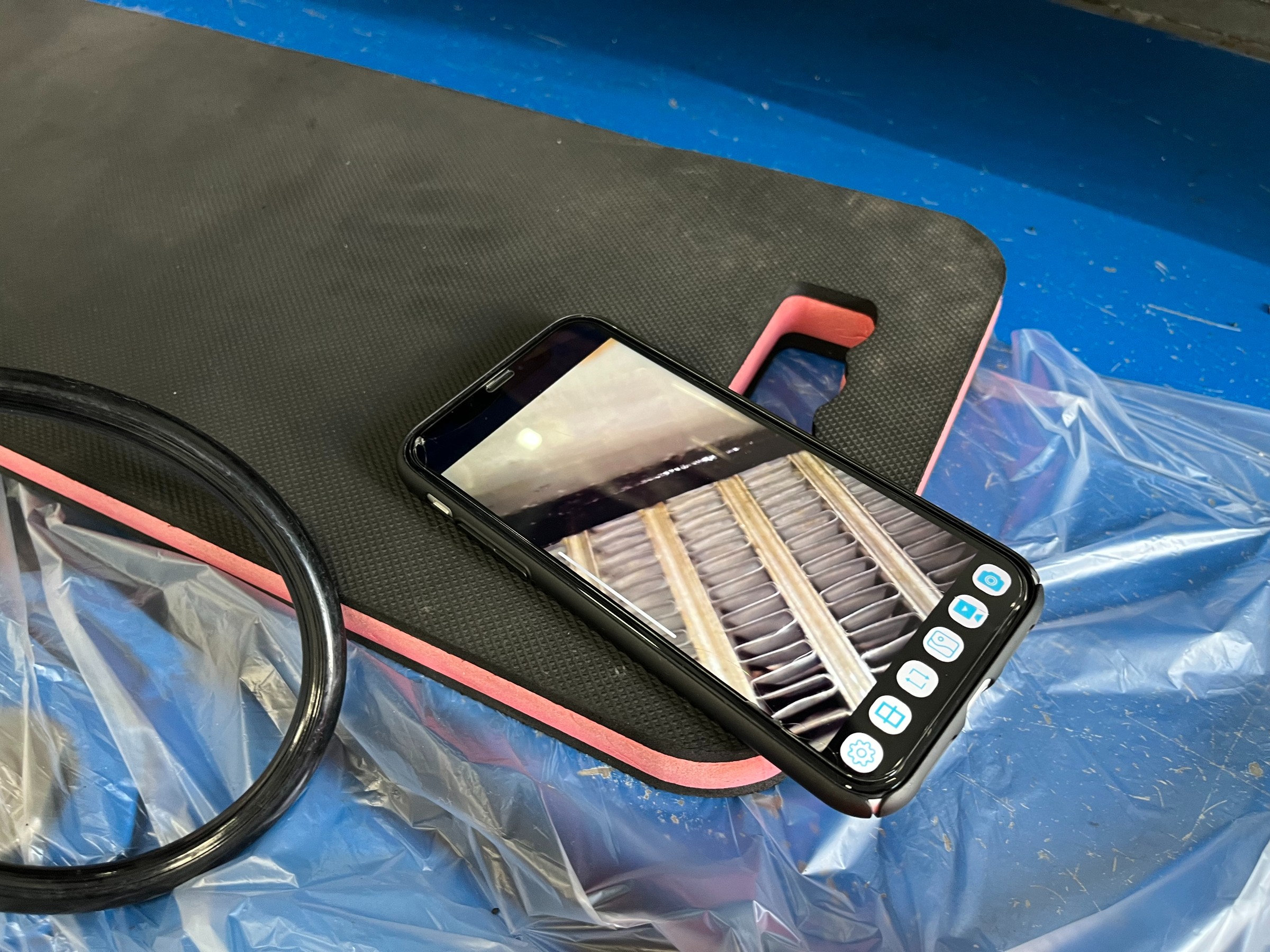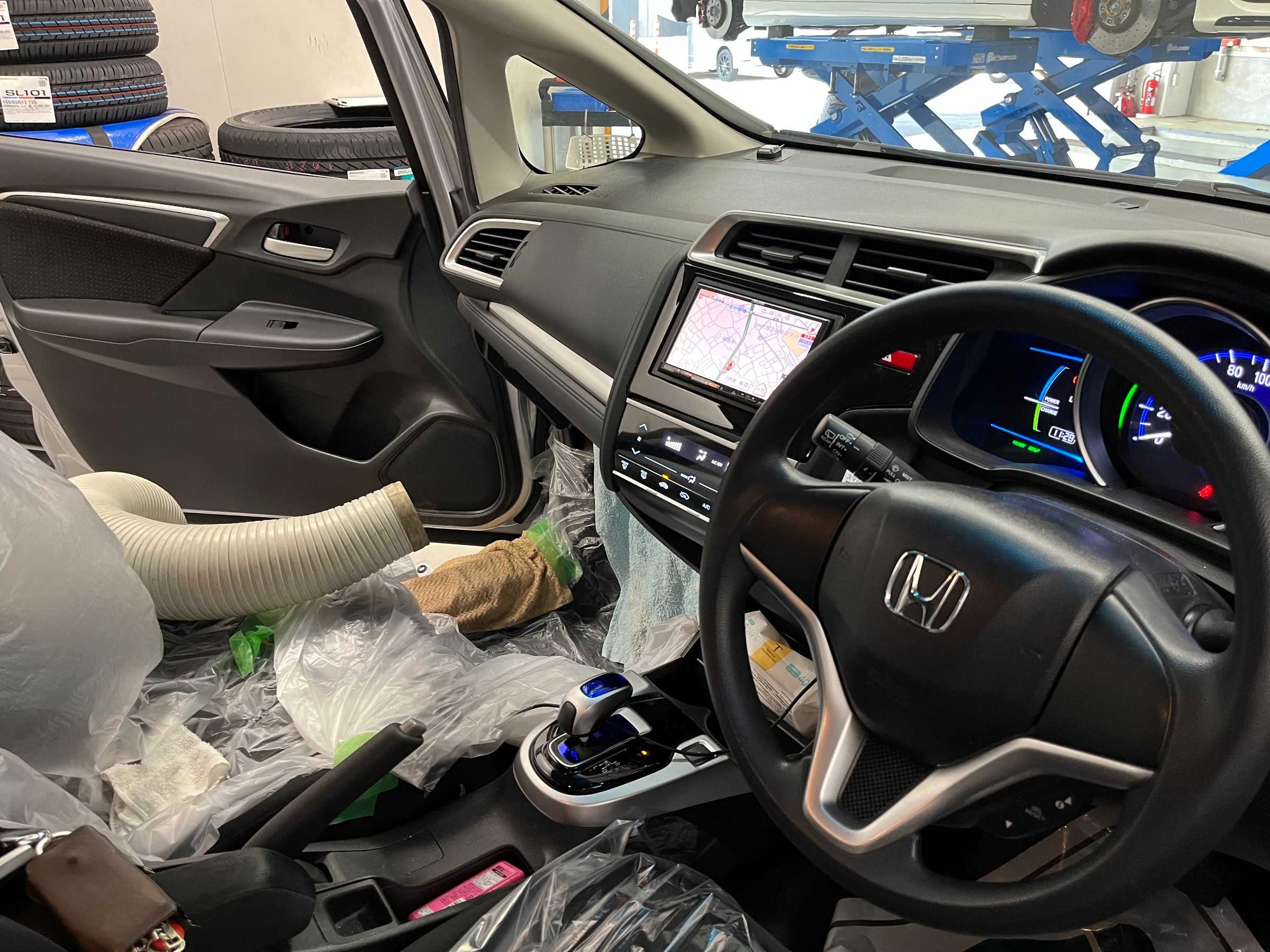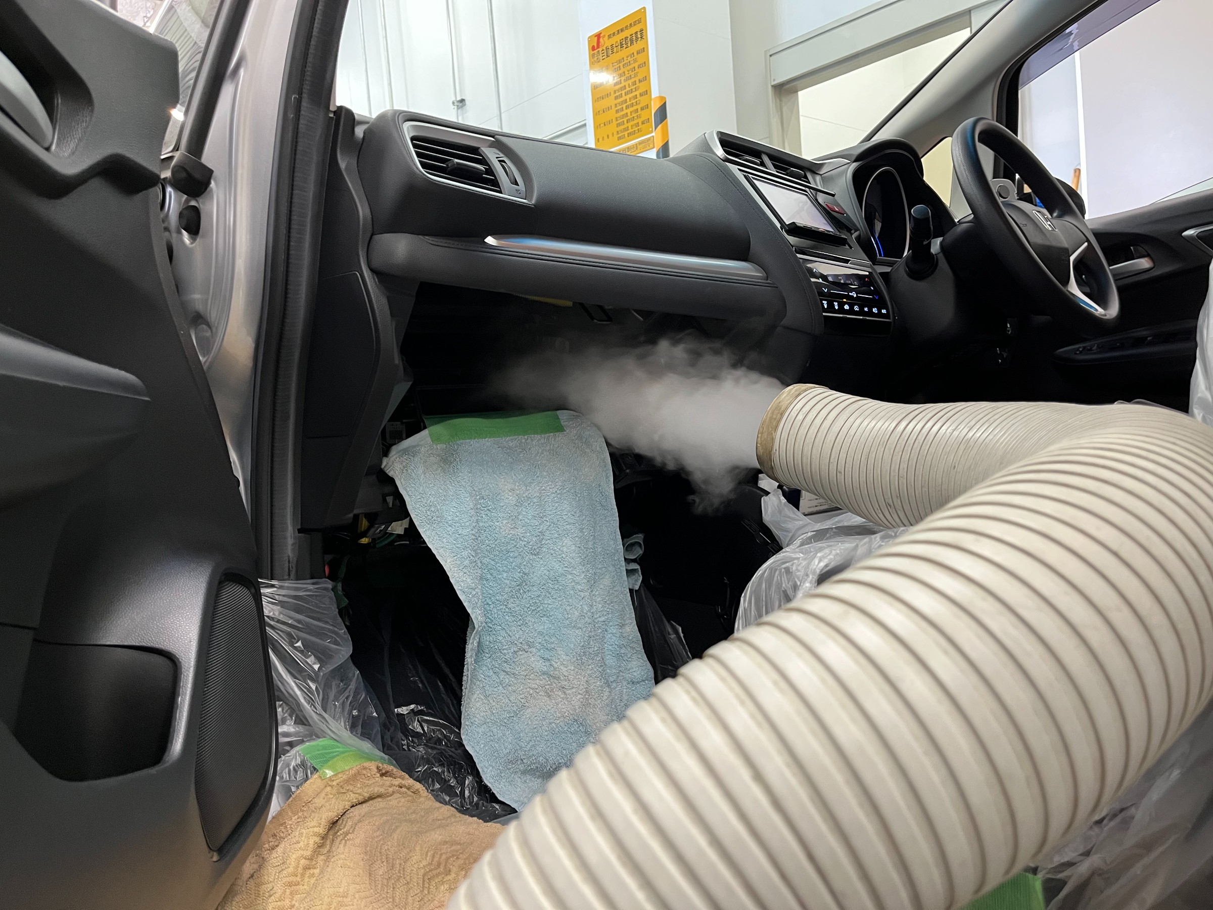 養生等カーエアコンクリーニングの準備を行い施工が始まります。