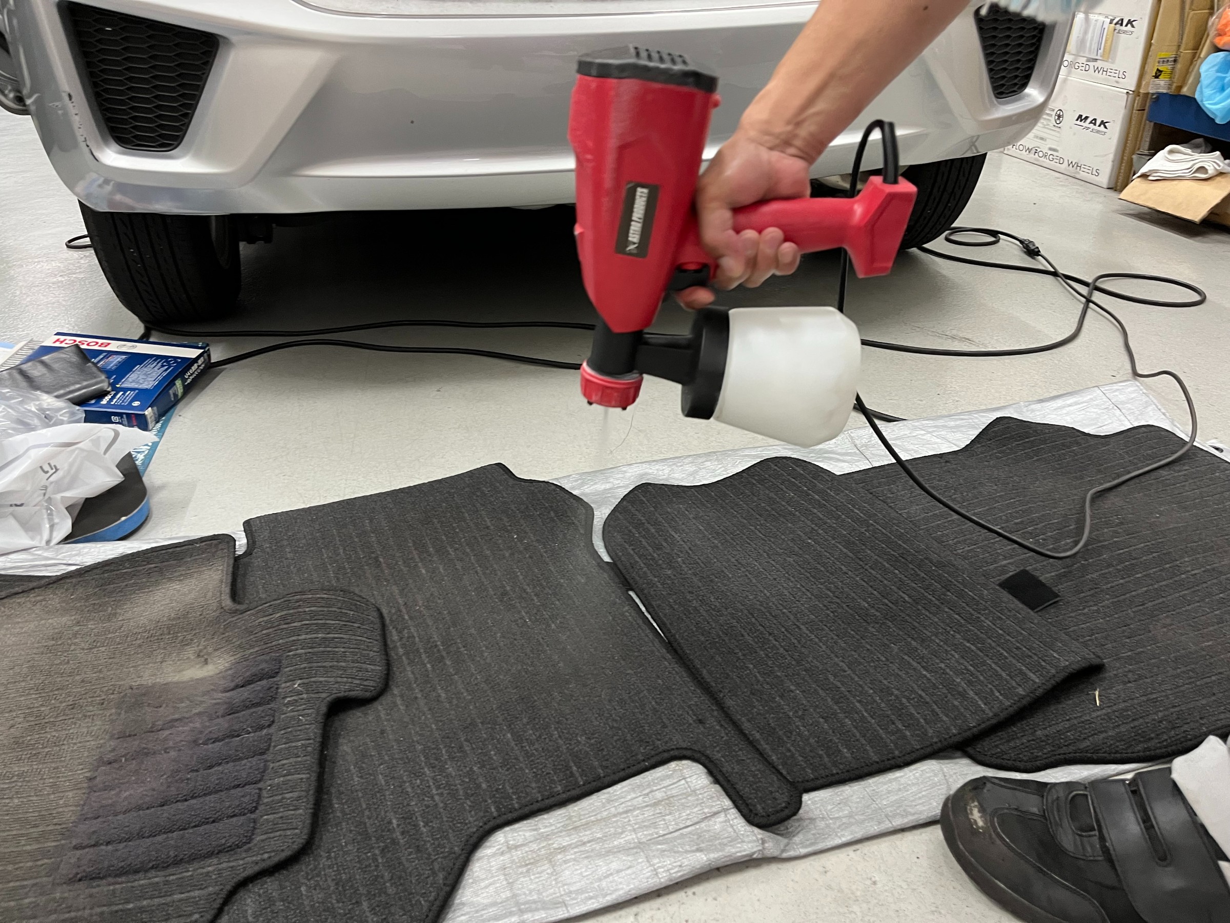 フロアマットやシート・ドアパネルから天井等専用の薬品を使い施工を行います。
