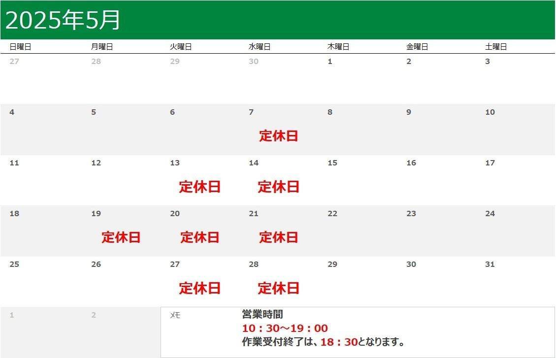 2025年5月17日 ツイート いつもコクピット21世田谷をご利用頂き誠に有難うございます。 5月19日・20日・21日 定休日とさせて頂きます。 ご注意ください。 ※5/19(月)~5/21(水)定休日とさせて頂きます。 Prev Next