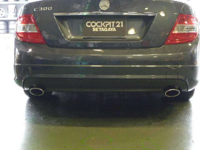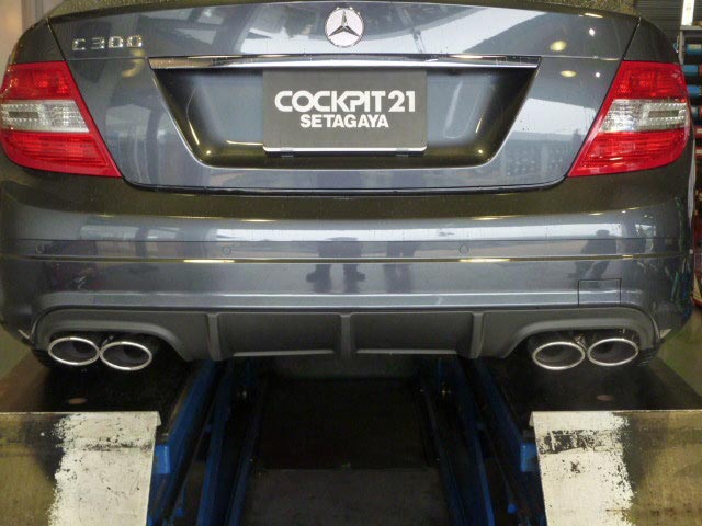 このマフラーはノーマルバンパーにも取付可能(バンパーカットが必要)ですが、今回はC63用の純正パネルを使用して取付いたしました。C300のは純正で左右出しですので、センターマフラーは装着しなくても取付可能です。しかし、今回はオーナー様のご希望によりフルセットでの交換をいたしました。