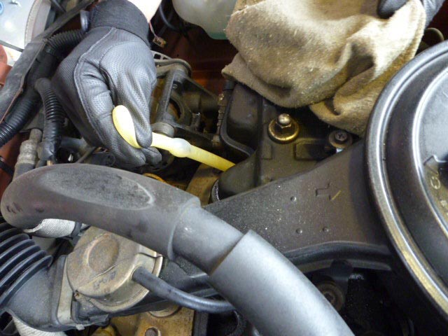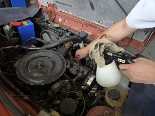 画像5 専用の道具を使用して薬剤を回収、プラグを戻しエンジンを掛け、白煙が無くなるまでアイドリングさせます。