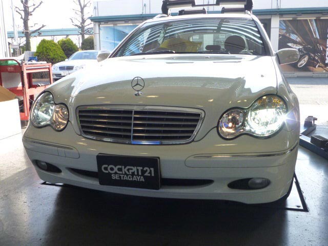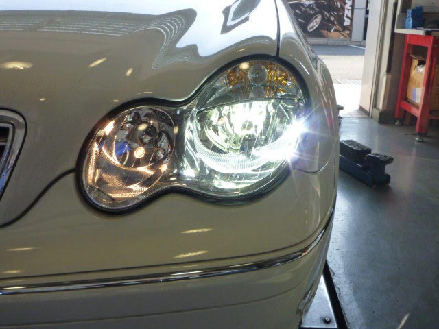 W203前期モデルを後期ハロゲンヘッドに交換した上で、キセノン化をいたしました。通常は後期キセノンヘッドに交換する事が殆どの作業ですが、今回はオーナー様の「レベライザーを活かしたまま取付したい」と言うご希望の為、この様な組み合わせをいたしました。