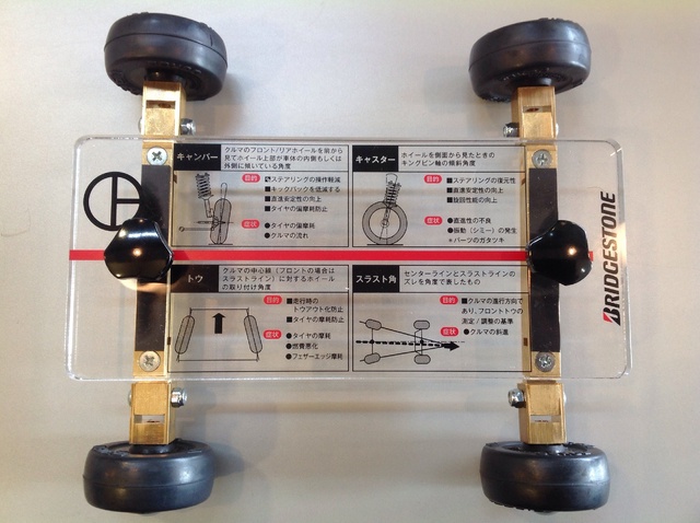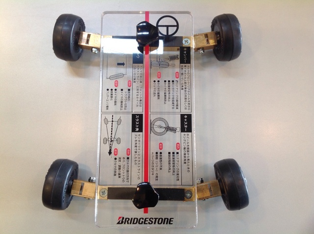 2014年11月16日 ツイート 当店にも導入されました、アライメントの状態を再現できる模型です(^-^)上から見たときのタイヤの角度の内股・ガニ股かの、トーと正面から見た時のハの字具合のキャンバーを再現できて、よりわかりやすくご説明できるかと思います。 Prev Next