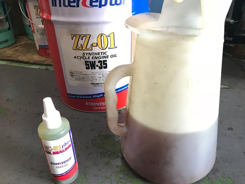 エンジンオイル交換と一緒に、オイル漏れ止め剤の「NC-81 plus」を添加します。