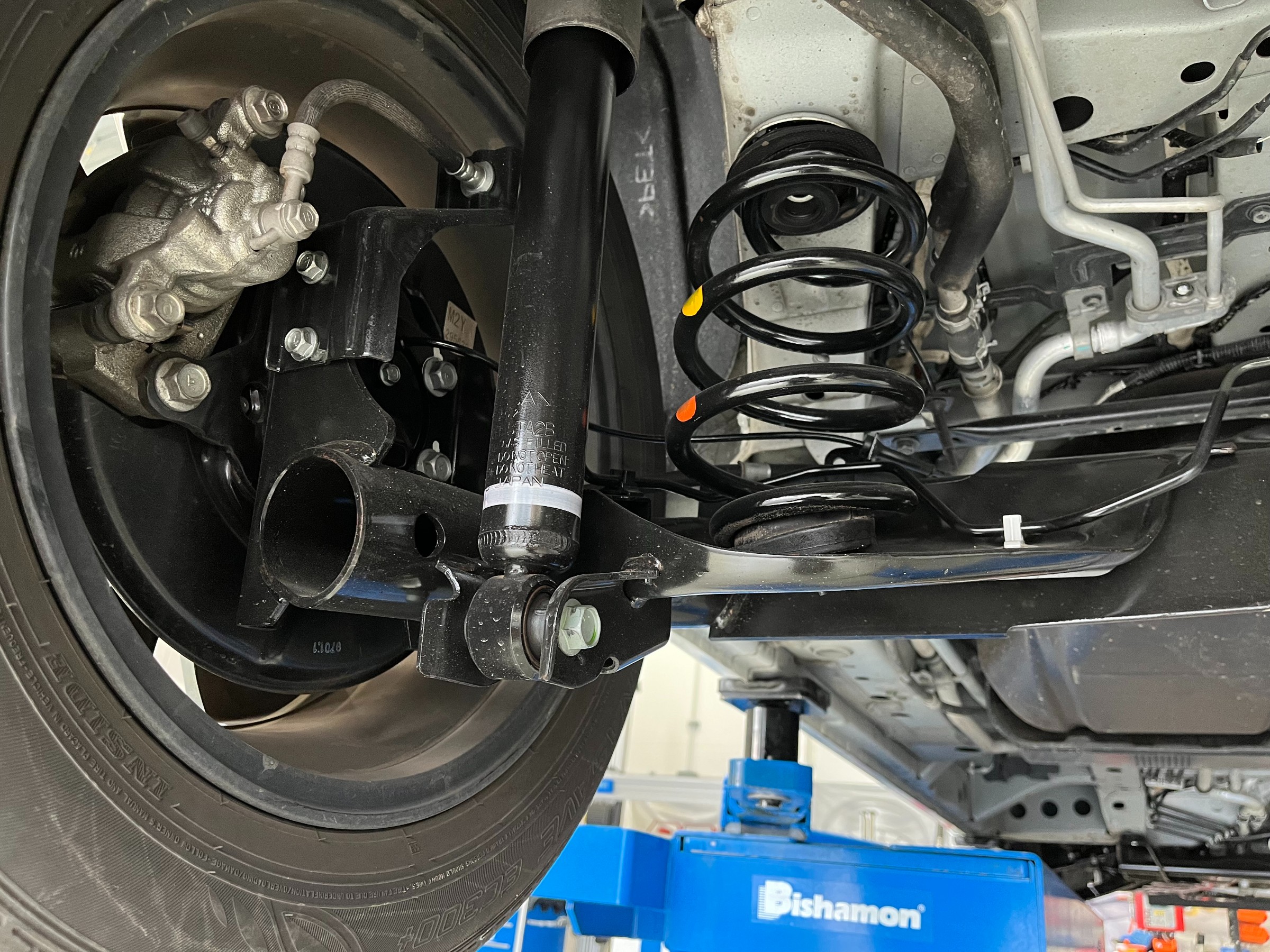 ショックと共締めと、ボディ側のサービスホールを利用してボルト/ナットの2か所を固定。。。