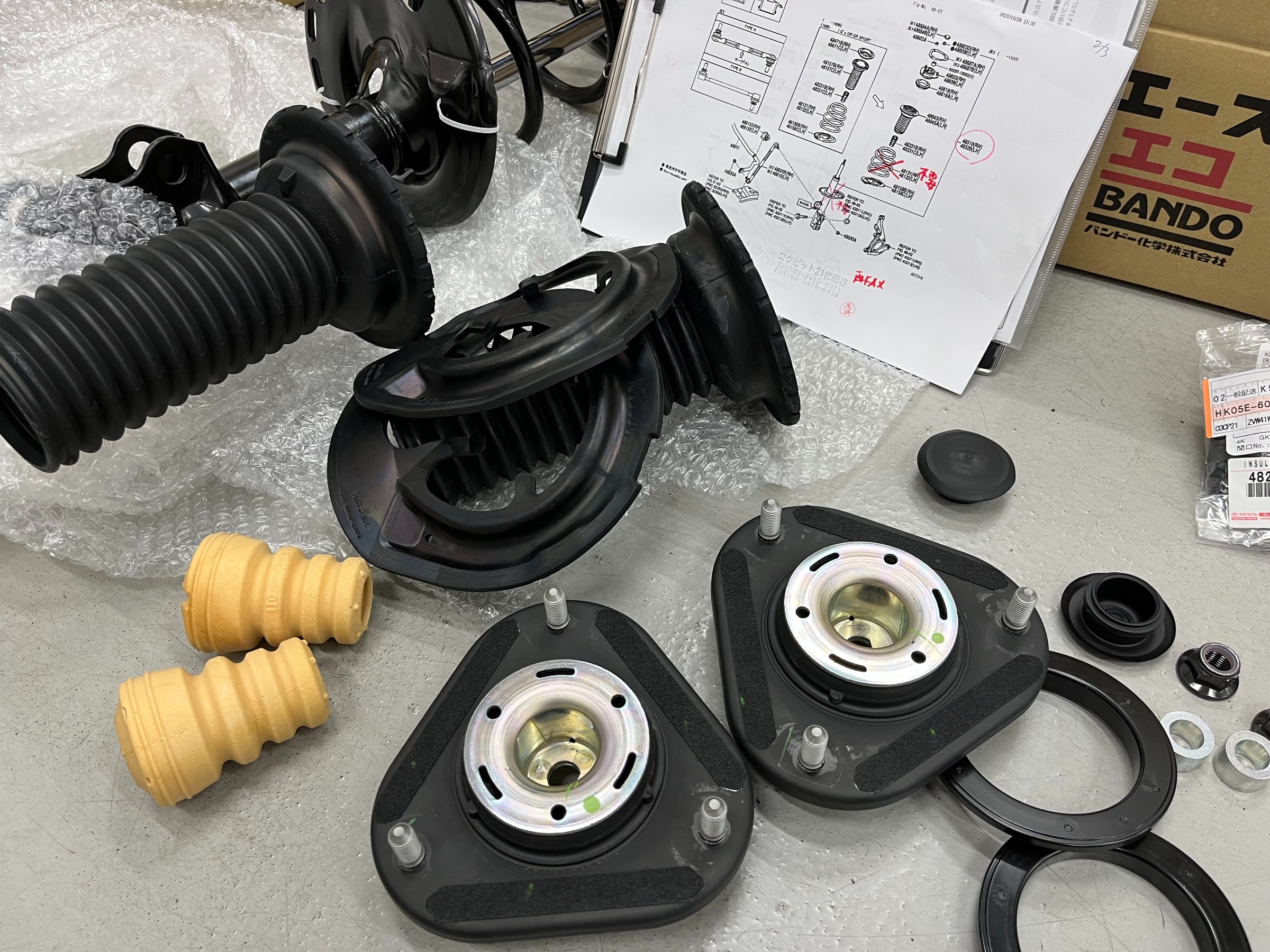 部品がどこまで必要か実車を確認しておりましたので部品を取り寄せし、事前にお預かりした“純正スプリングとショック”に組み付けできるところは先に準備しておりました。