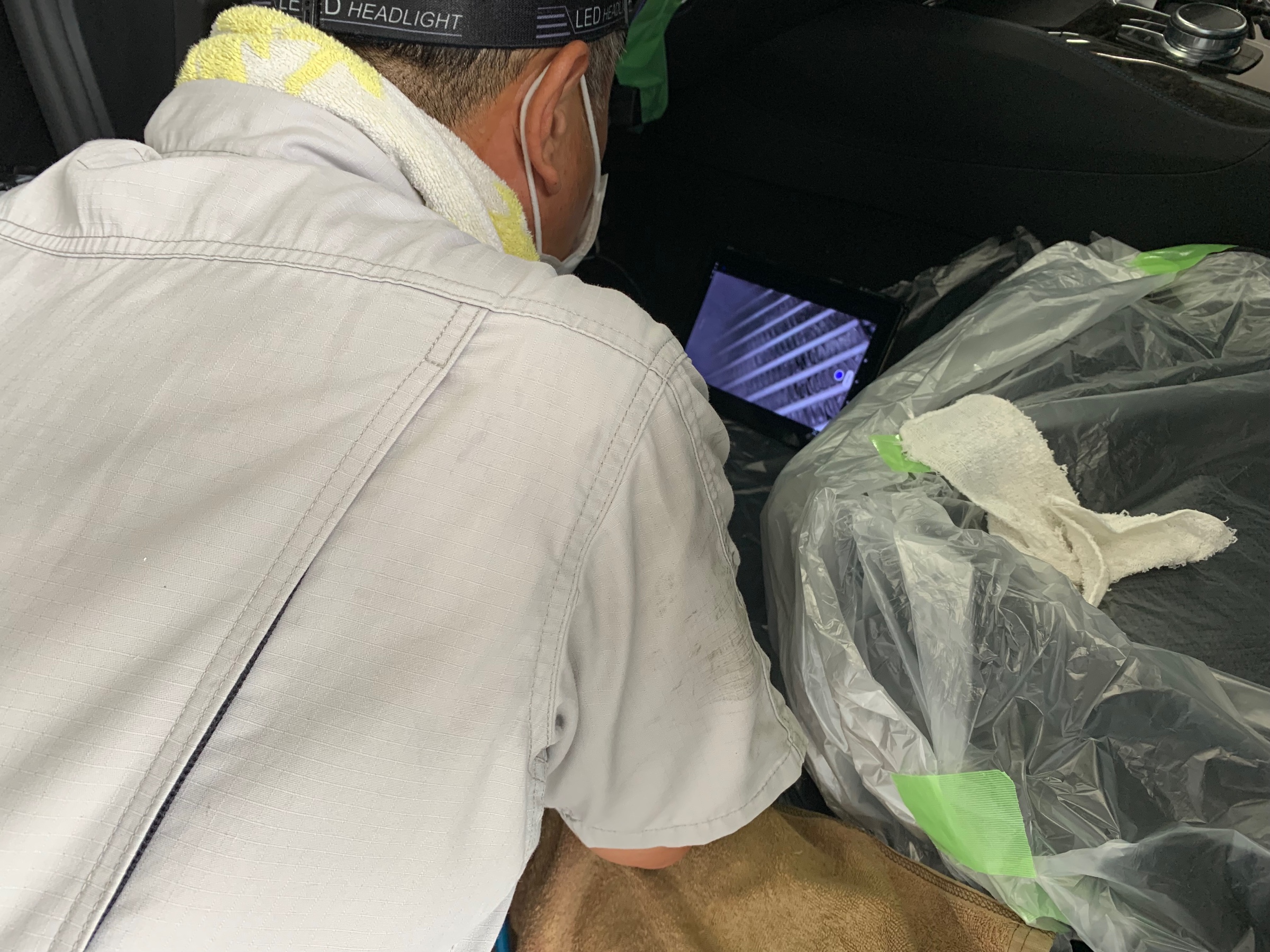カメラでエバポレーターの汚れ具合を確認しながら