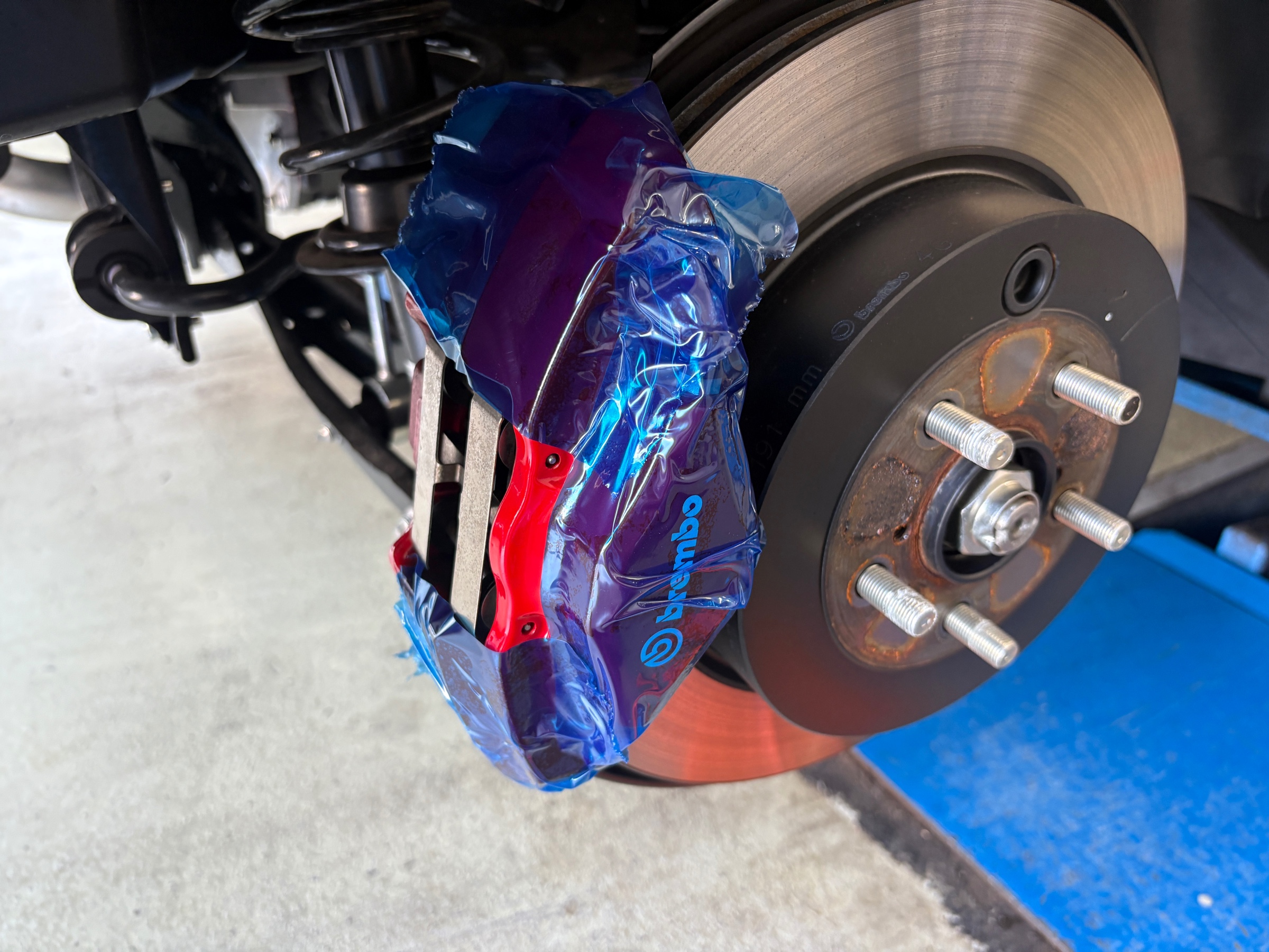 作業はキャリパーに傷をつけないよう保護をして慎重に実施。