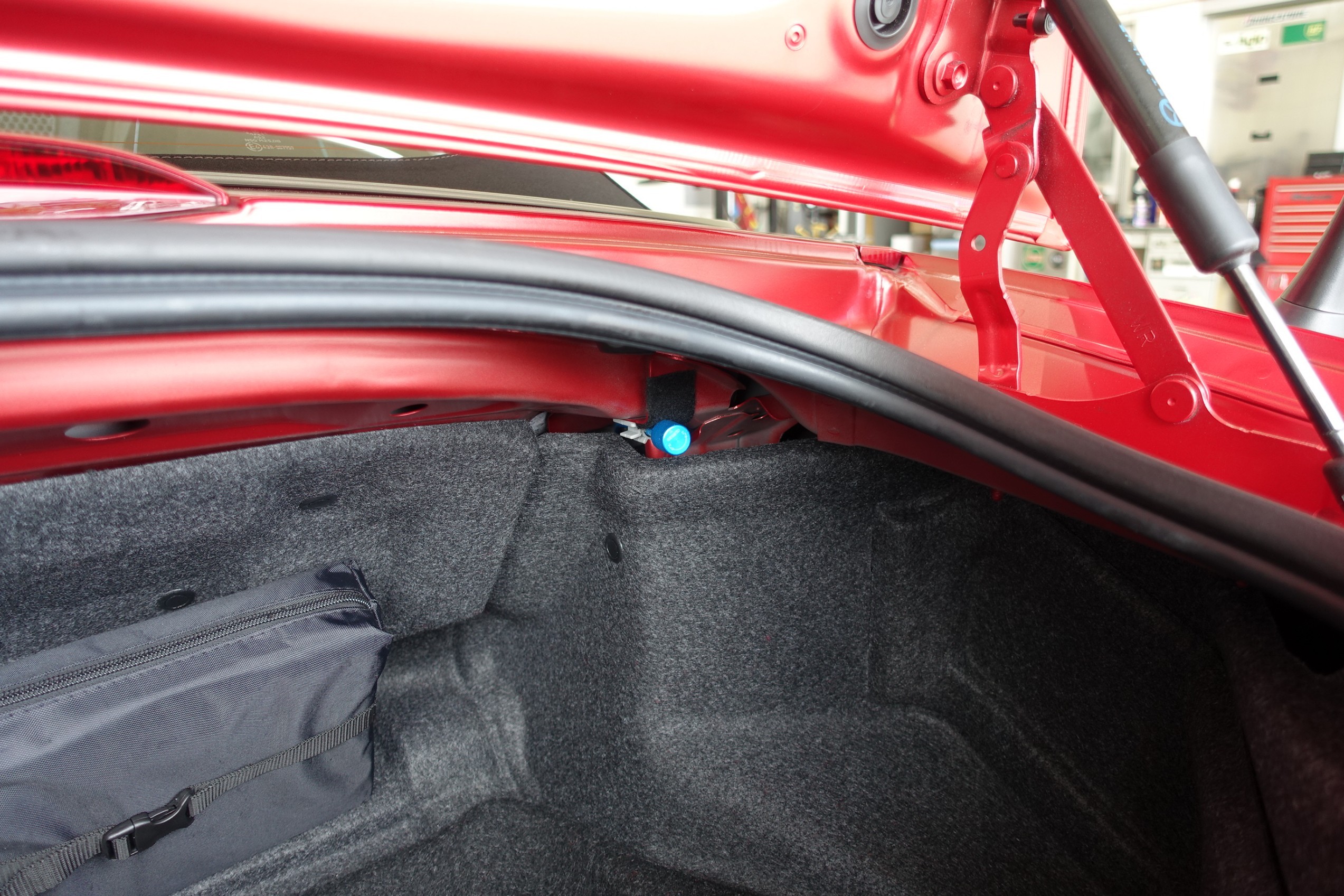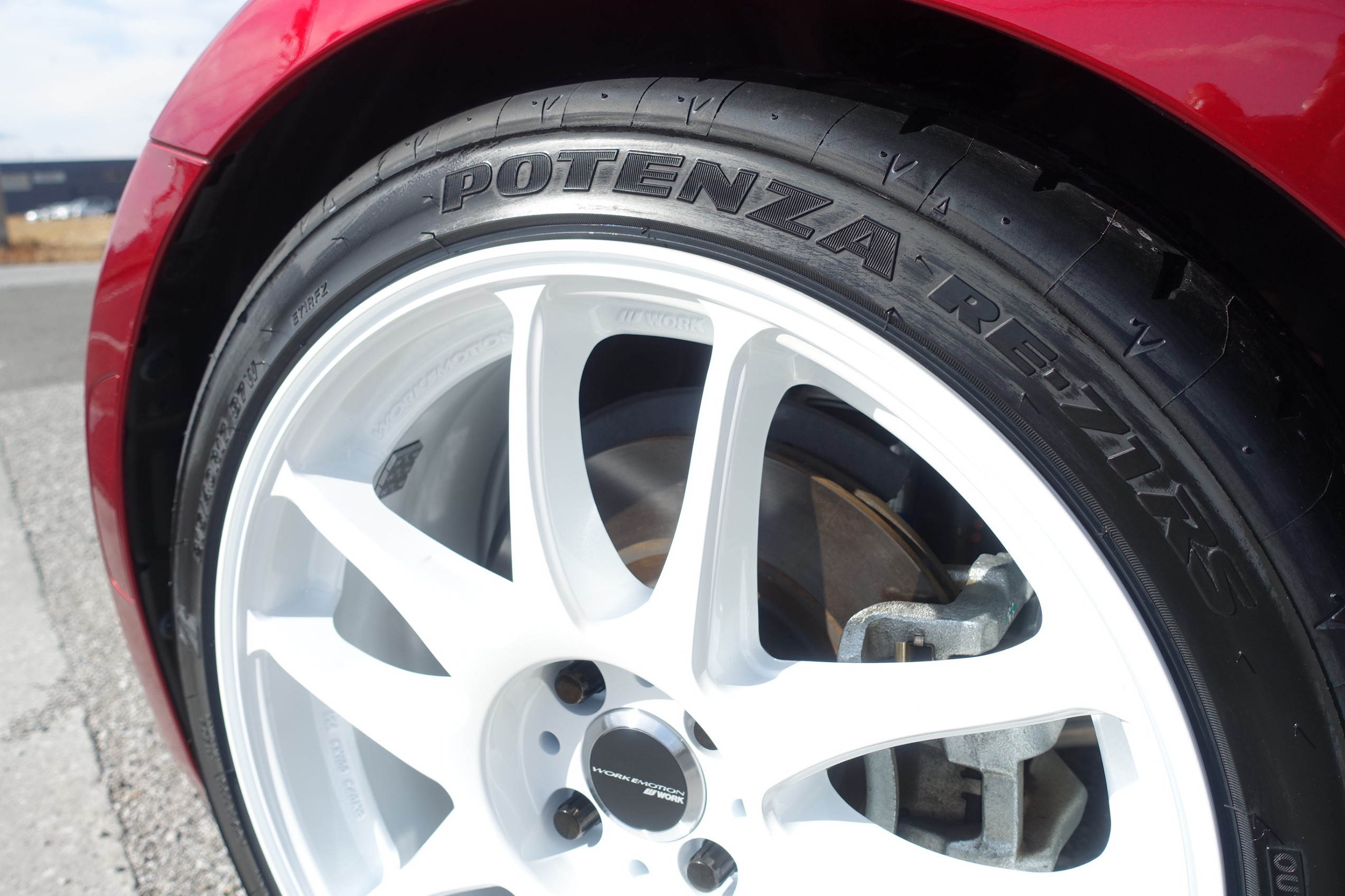 赤と白のコントラストが目を引くタイヤホイール、