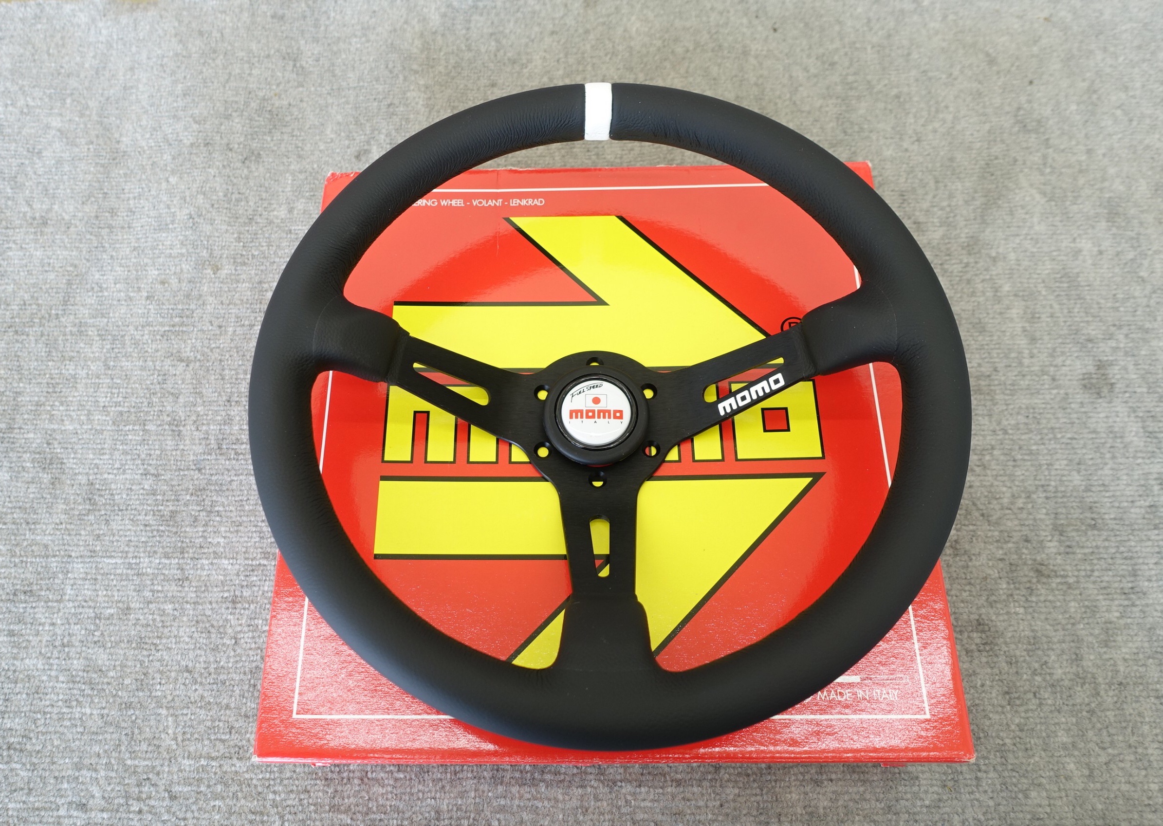 「MOMO FULL SPEED BKレザー/BKスポーク WHITE TOP」