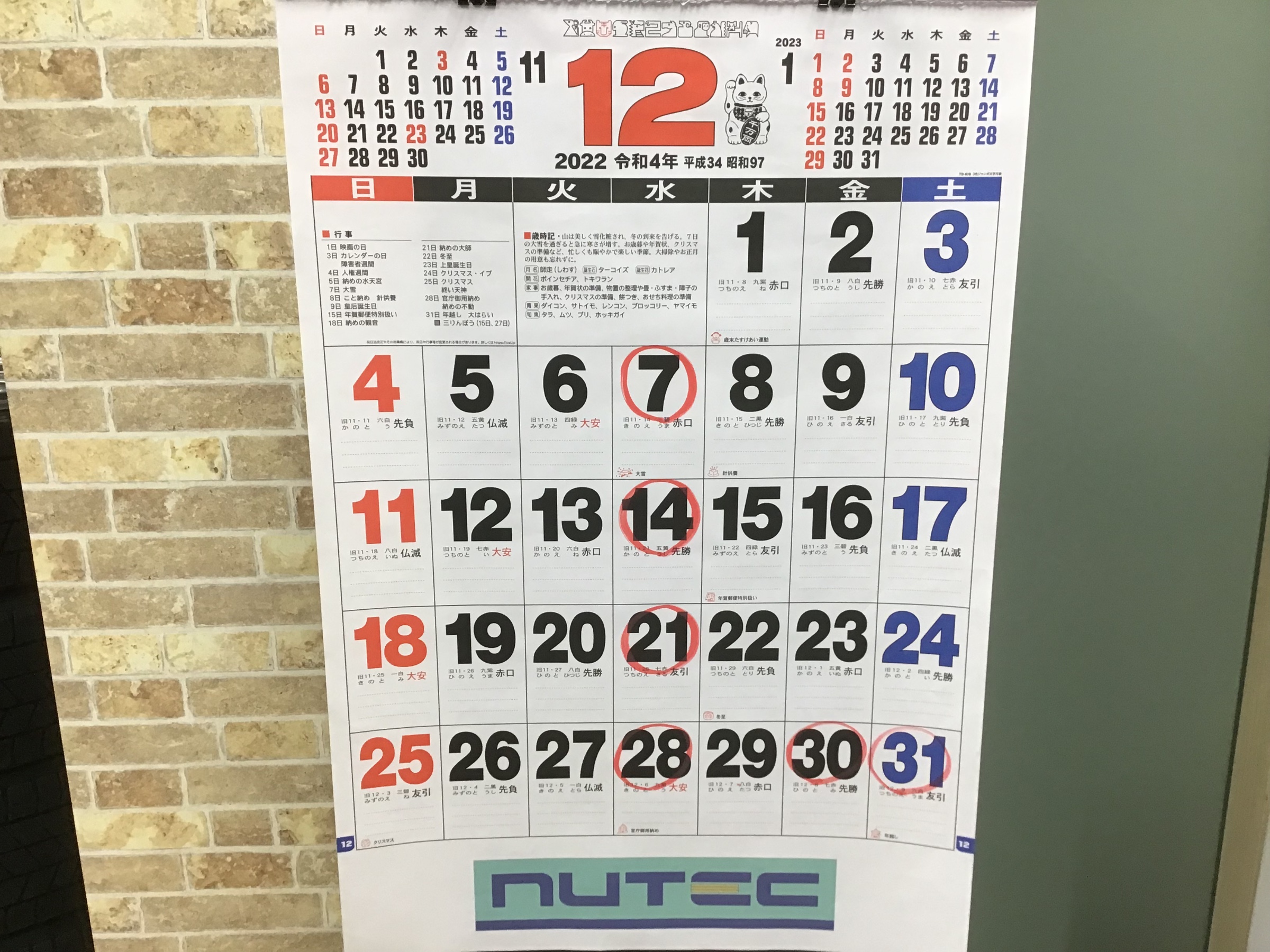 12月の定休日と年末年始の休業日は