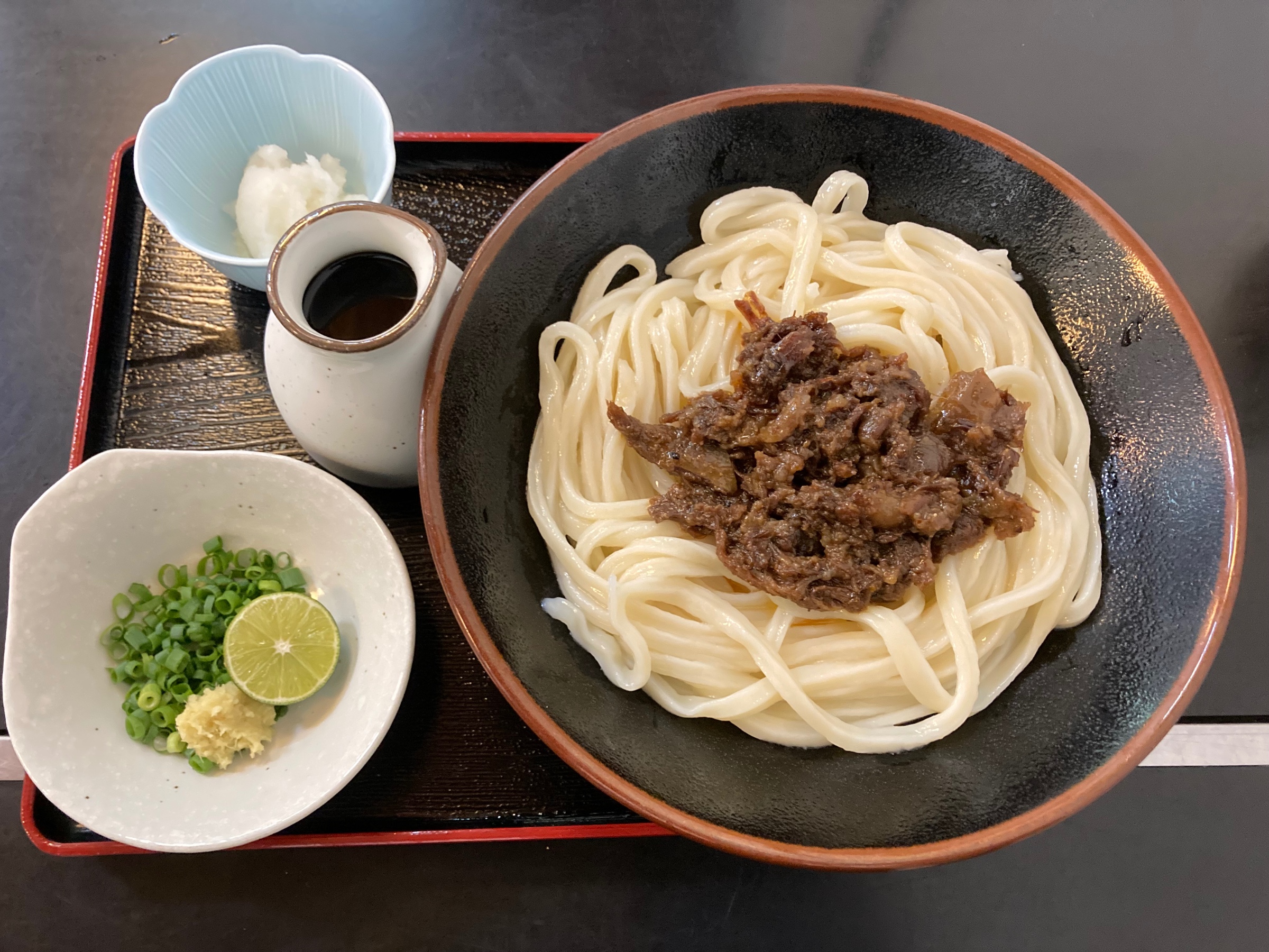 「ピリ辛 すじ肉ぶっかけうどん」