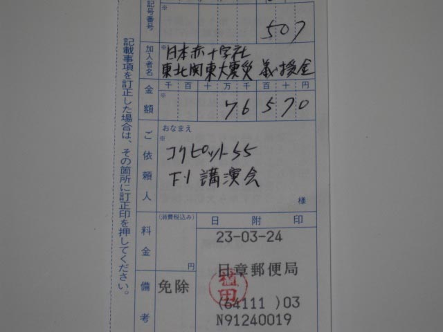 2011年3月24日 ツイート 当店での募金箱や今回の講演会での募金などの合計金額¥76570を本日、南国市にある日章郵便局より日本赤十字社 東北関東大震災義援金に全額振り込みしました。皆様からのお気持ちが被災地に届けられることだと思います。ご協力本当にありがとうございました。 Prev Next