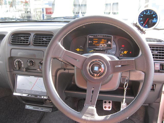 ハンドルはナルディクラシックで「通」のφ34(グレークロスステッチ)、