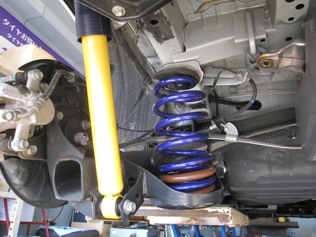 今回は最近足回りから異音がでていたこともあり、ローファーキットとアッパーマウントなど劣化した純正部品一式で交換させていただきました。