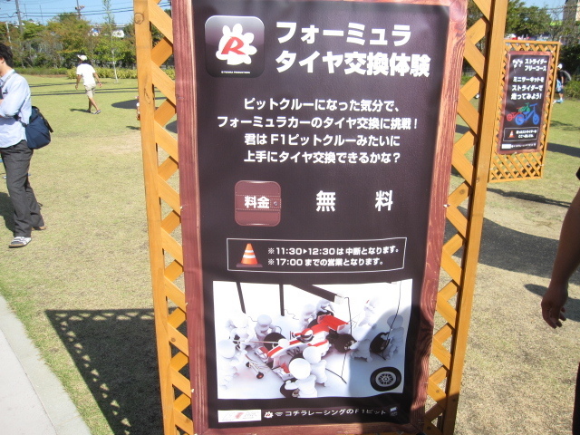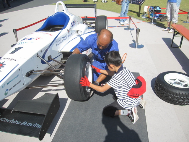また数年前から、お子様向けのイベントも盛りだくさんで、画像のようなフォーミュラータイヤ交換体験や、