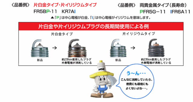 片側のみイリジウムのタイプなどは約20000km、高回転を多用する軽自動車なら半分の10000kmでの交換が必要なんです。