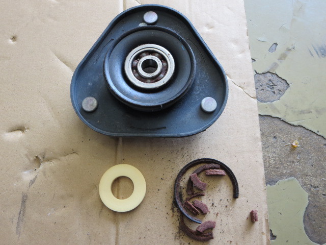 分解すると、4段目右・5段目左画像を見ると分かるように、アッパーマウントのベアリングシートは粉々、