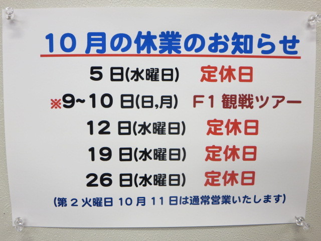 10月9日(日)、10日(月)の二日間は、毎年恒例のF1観戦ツアー開催のため休業させて頂きます。