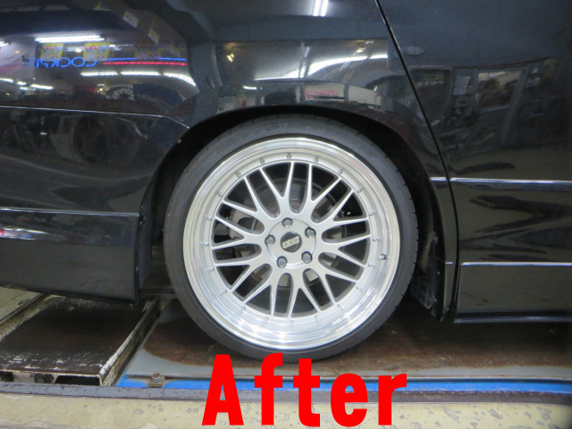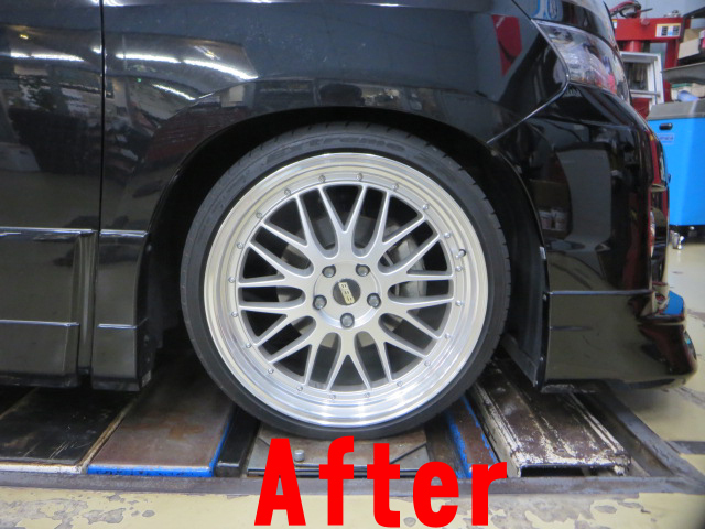 フロントのストラット取り付けボルトのガタを利用して、キャンバー値の左右差が極力少なくなるように組み付け。