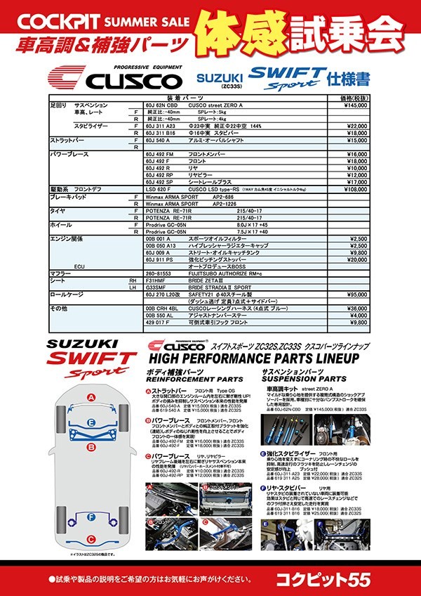 今回ご紹介したクスコデモカー 新型スイフトスポーツ(ZC33S)の体感試乗会を