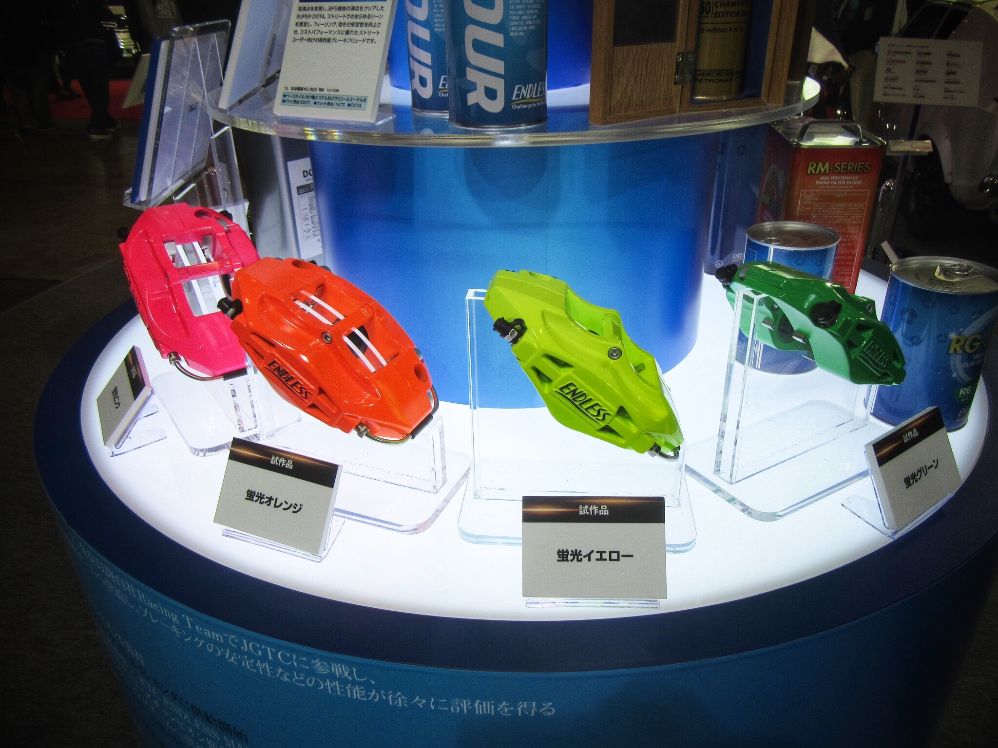 目がチカチカするほど眩しい、色鮮やかなキャリパーの新色が展示されていました。