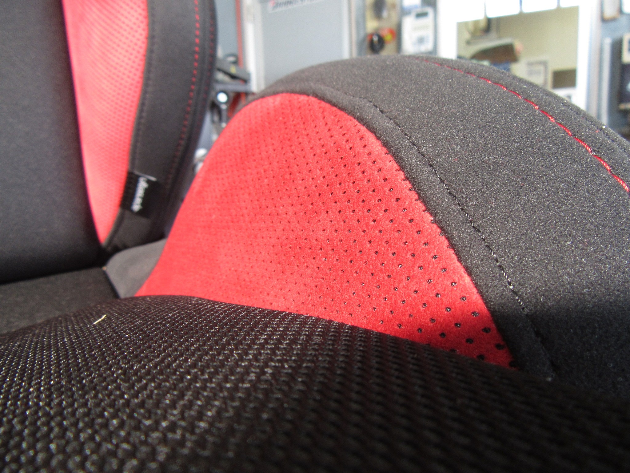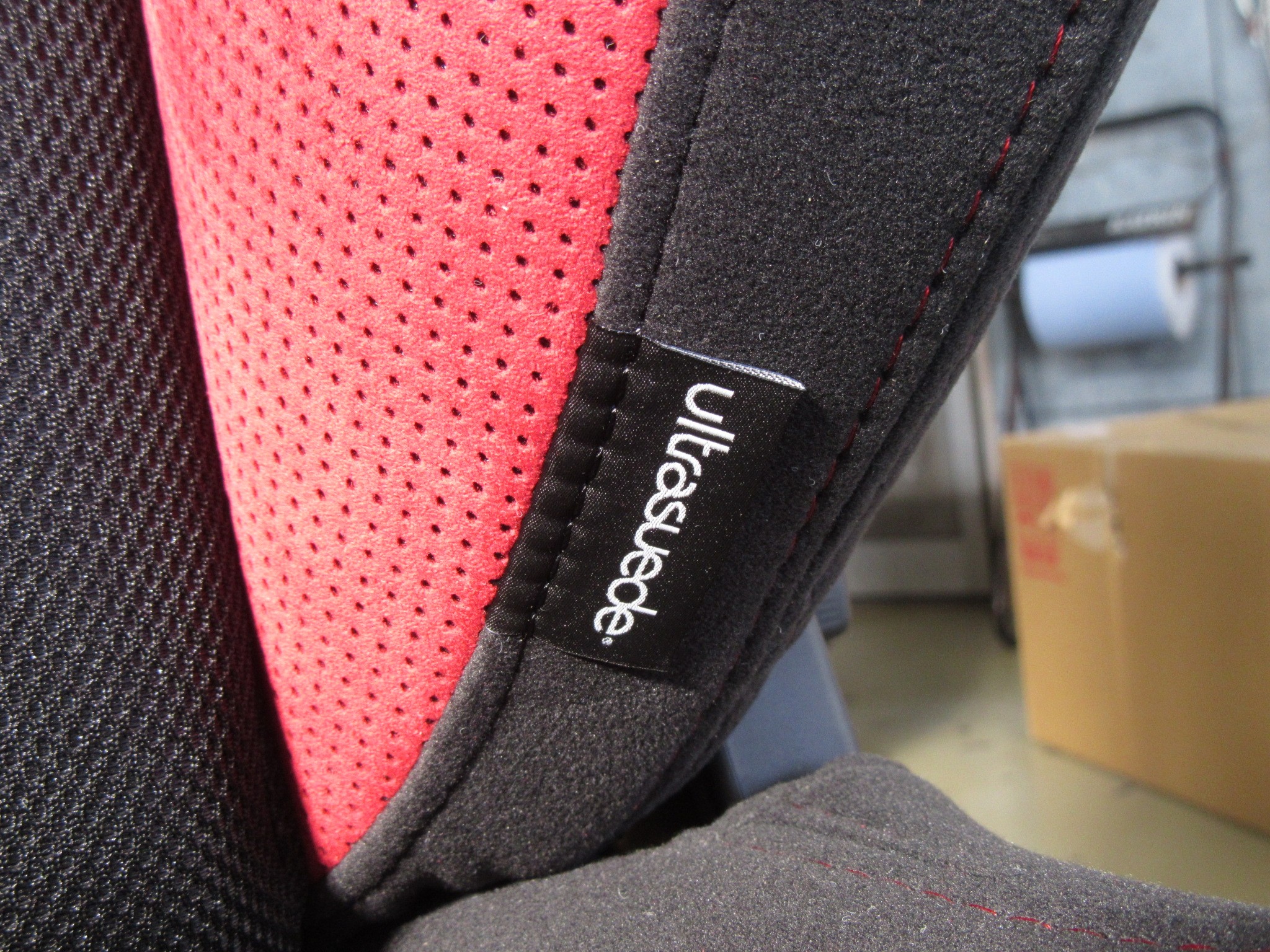 専用タグの付いた、高級なレッドのウルトラスウェード生地!