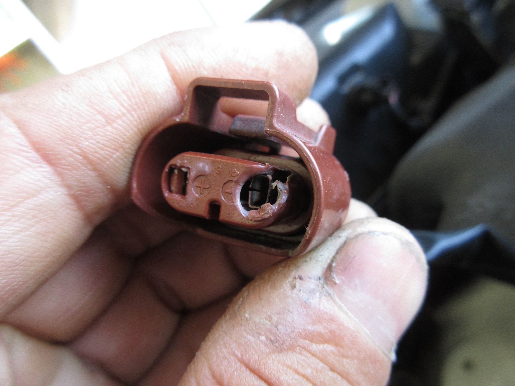 端子部の導通が悪くなって熱を持ち、端子を焦がしてカプラーも溶かしたんだと思われます。