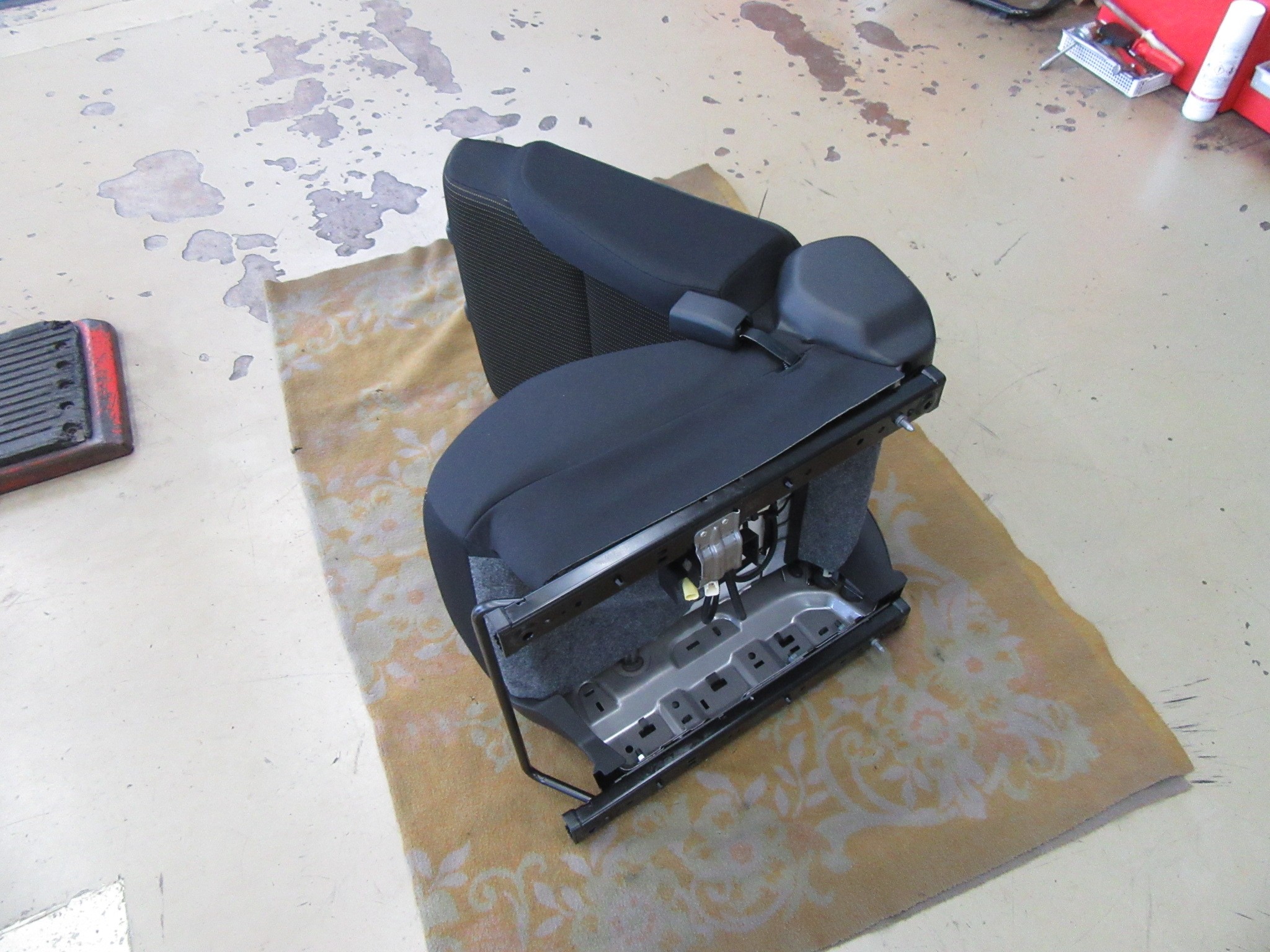 シートベルトのバックルなど、レカロシートに移植する部品を取り外します。