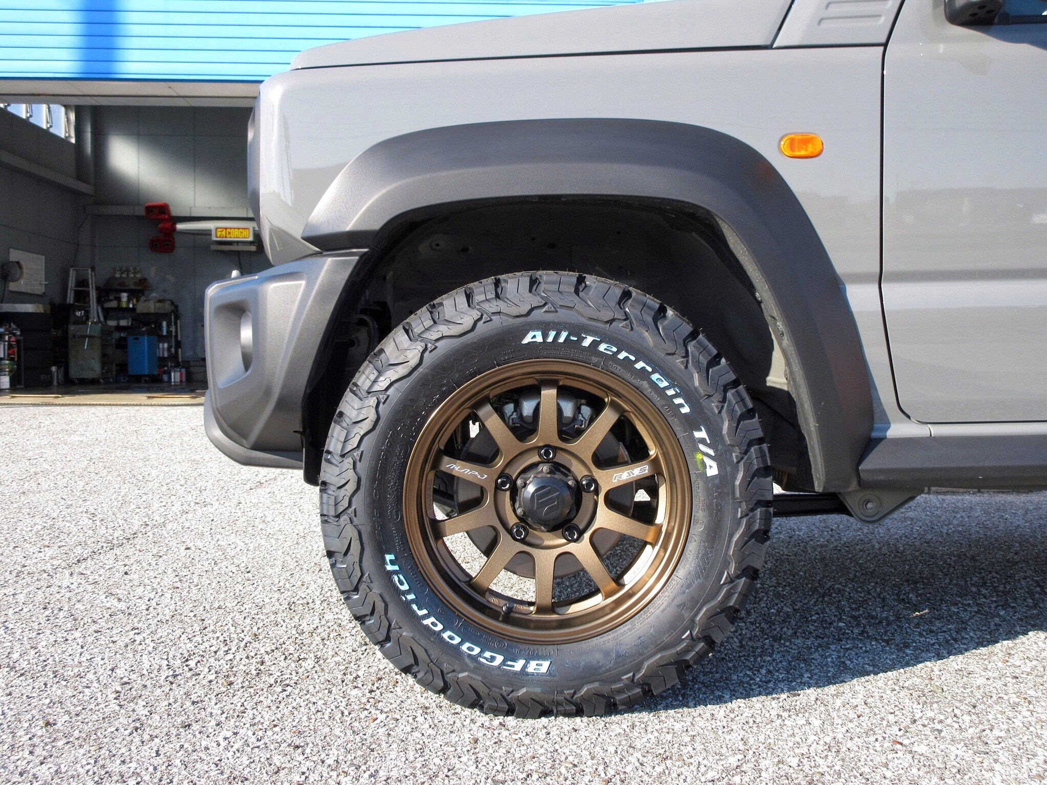 まずは、ジムニーらしいミディアムグレー色のボディからノーマルホイールを外し、