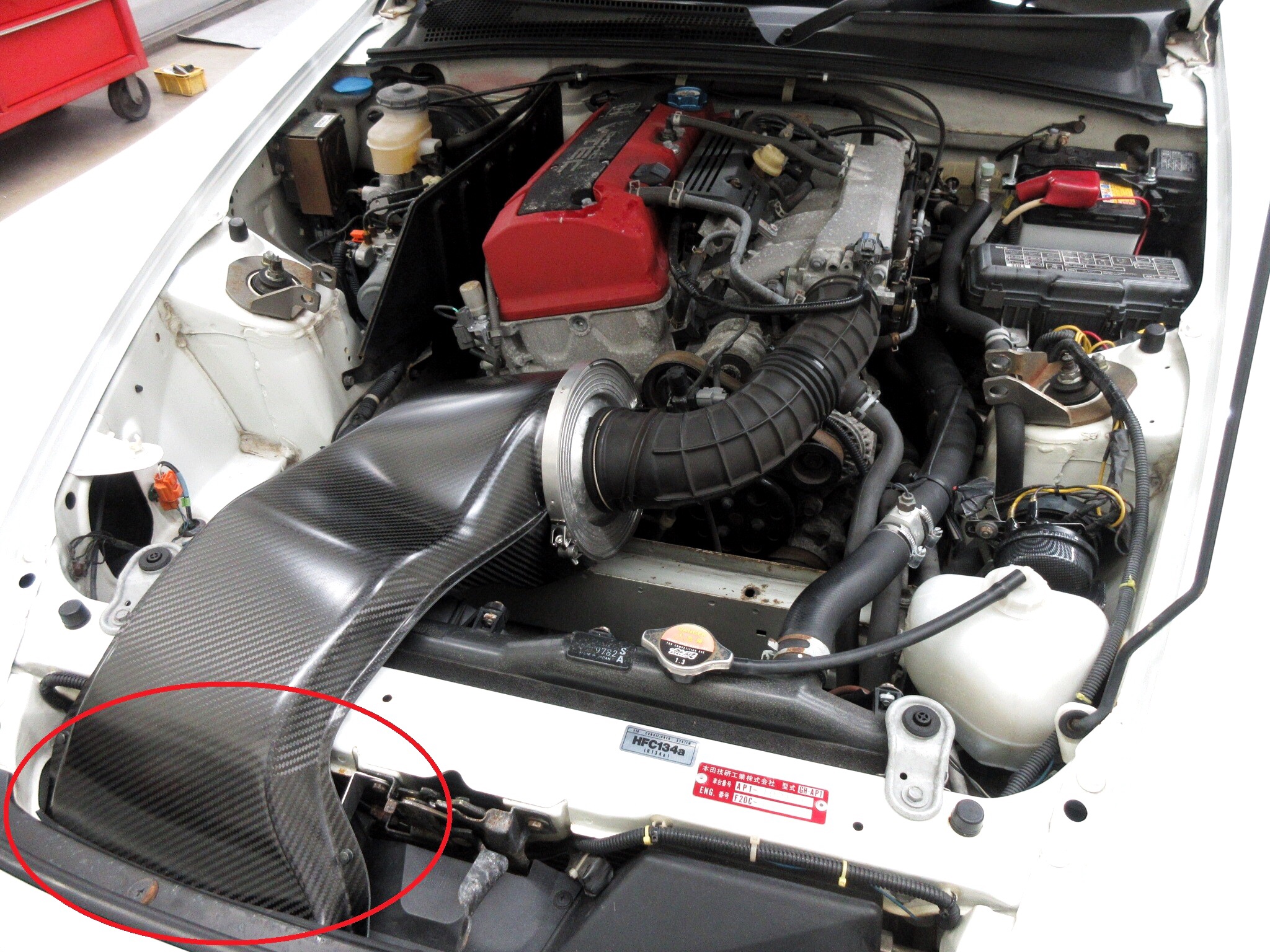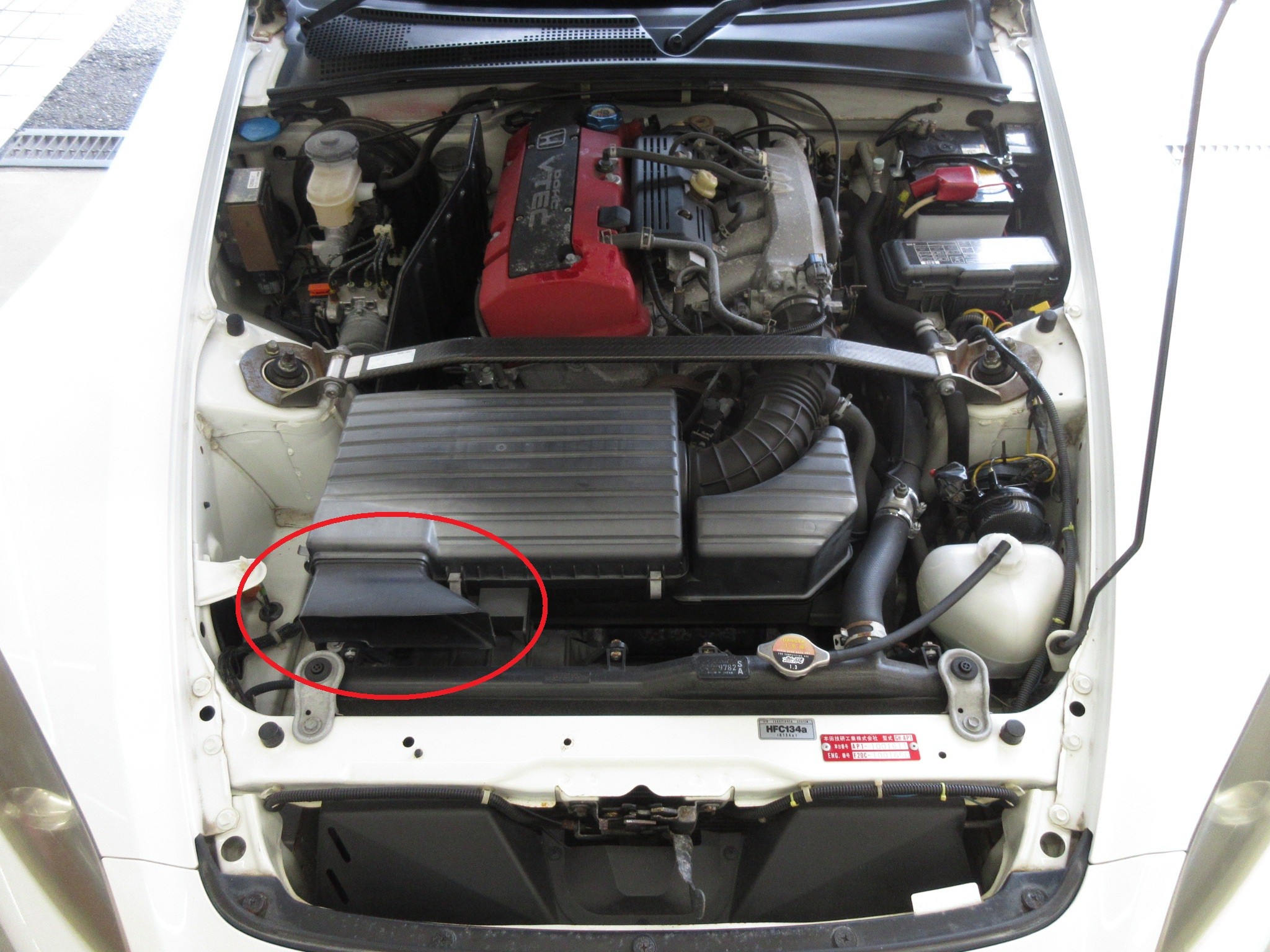 大事な空気の取り入れ口はエンジンルーム内の赤丸部分。
