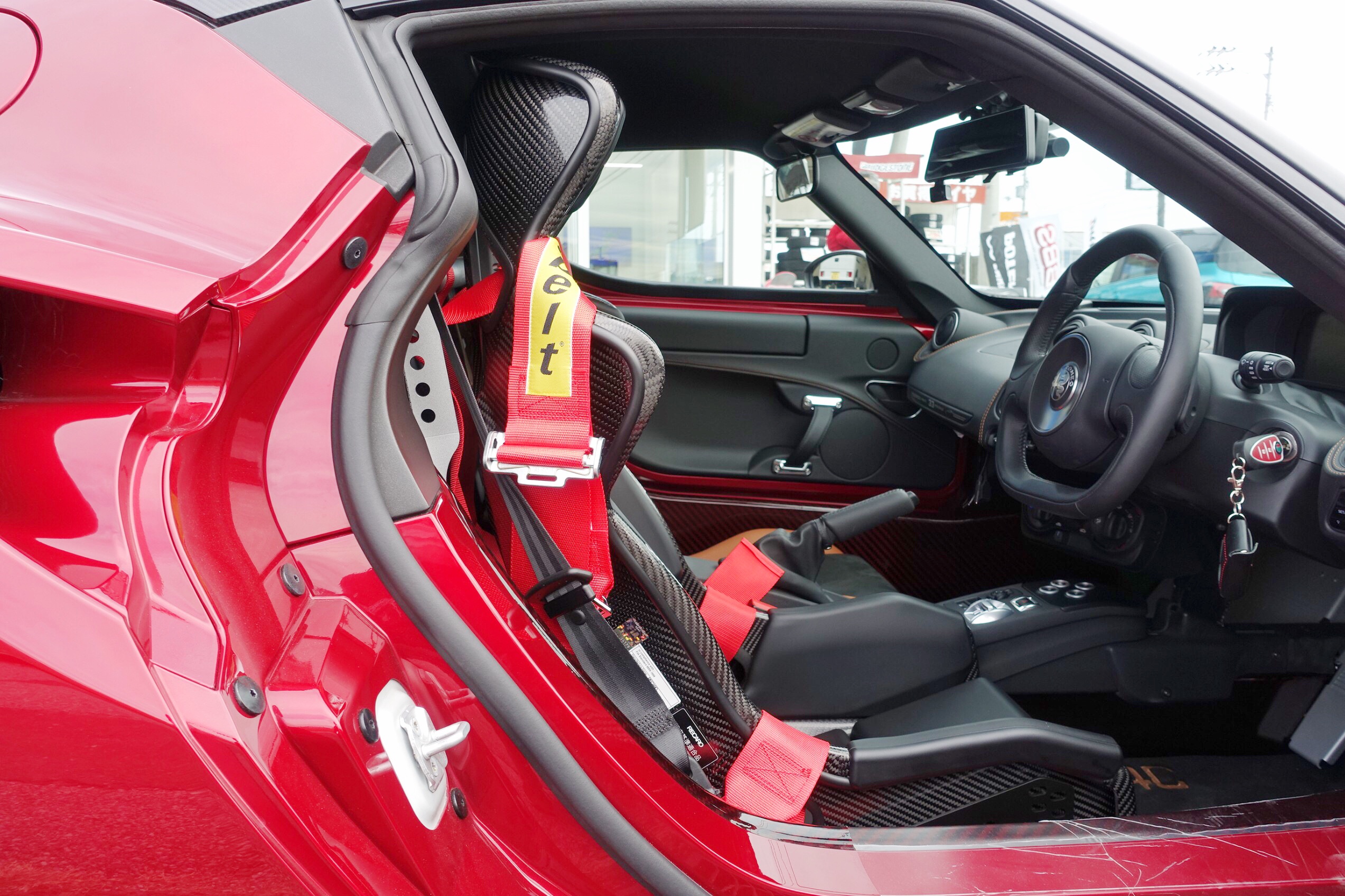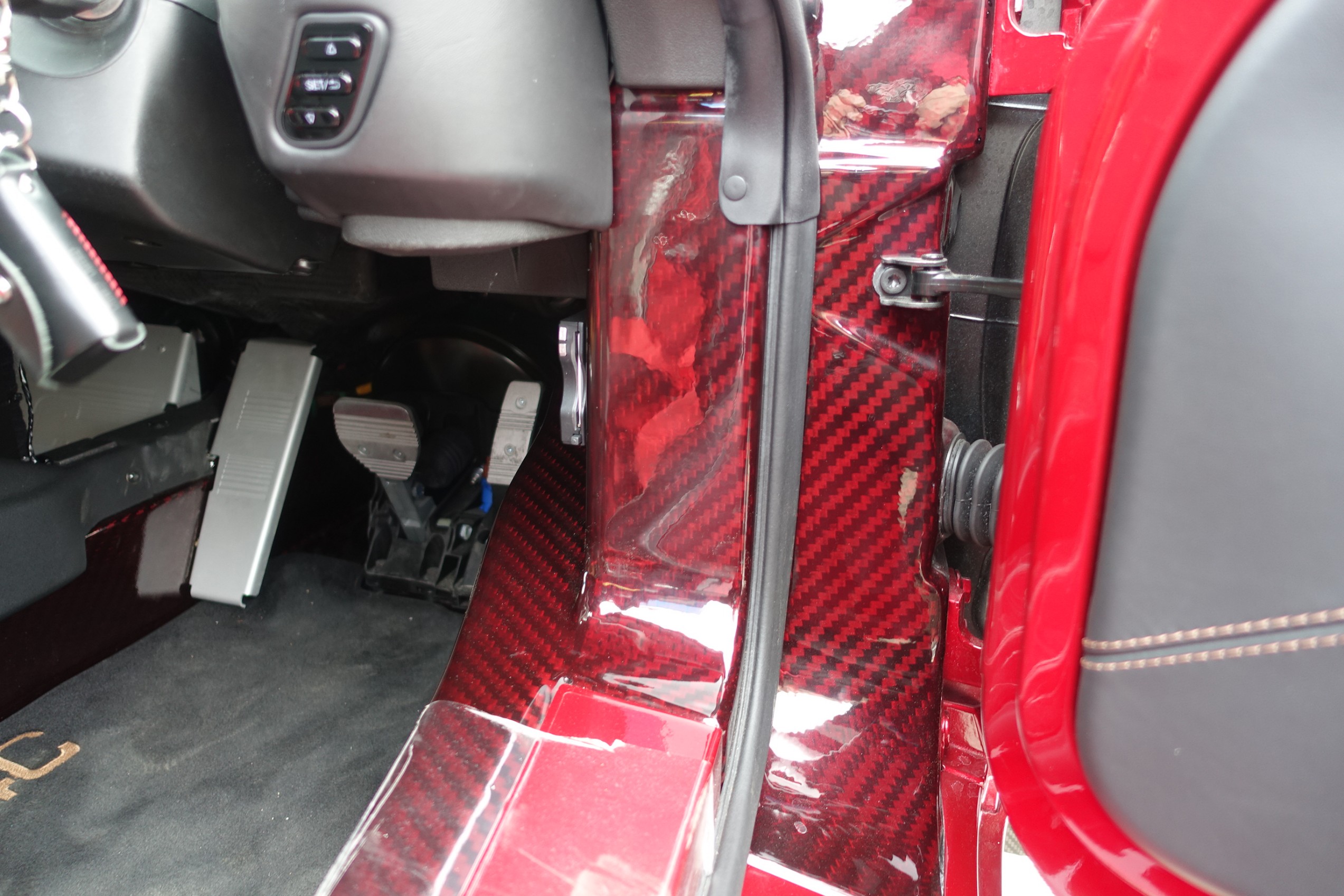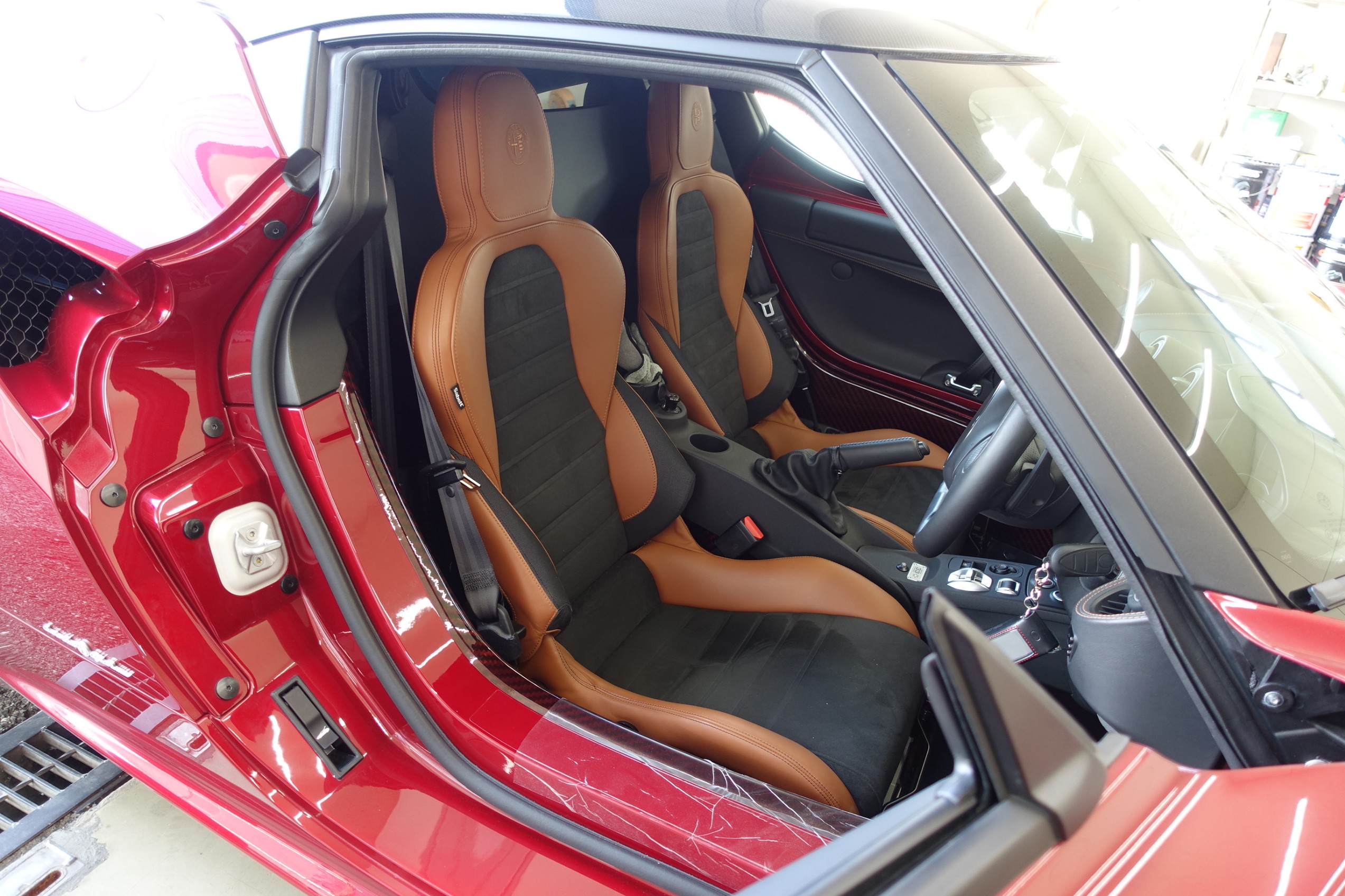 まずはレッドカーボンの車内をしっかり養生してから