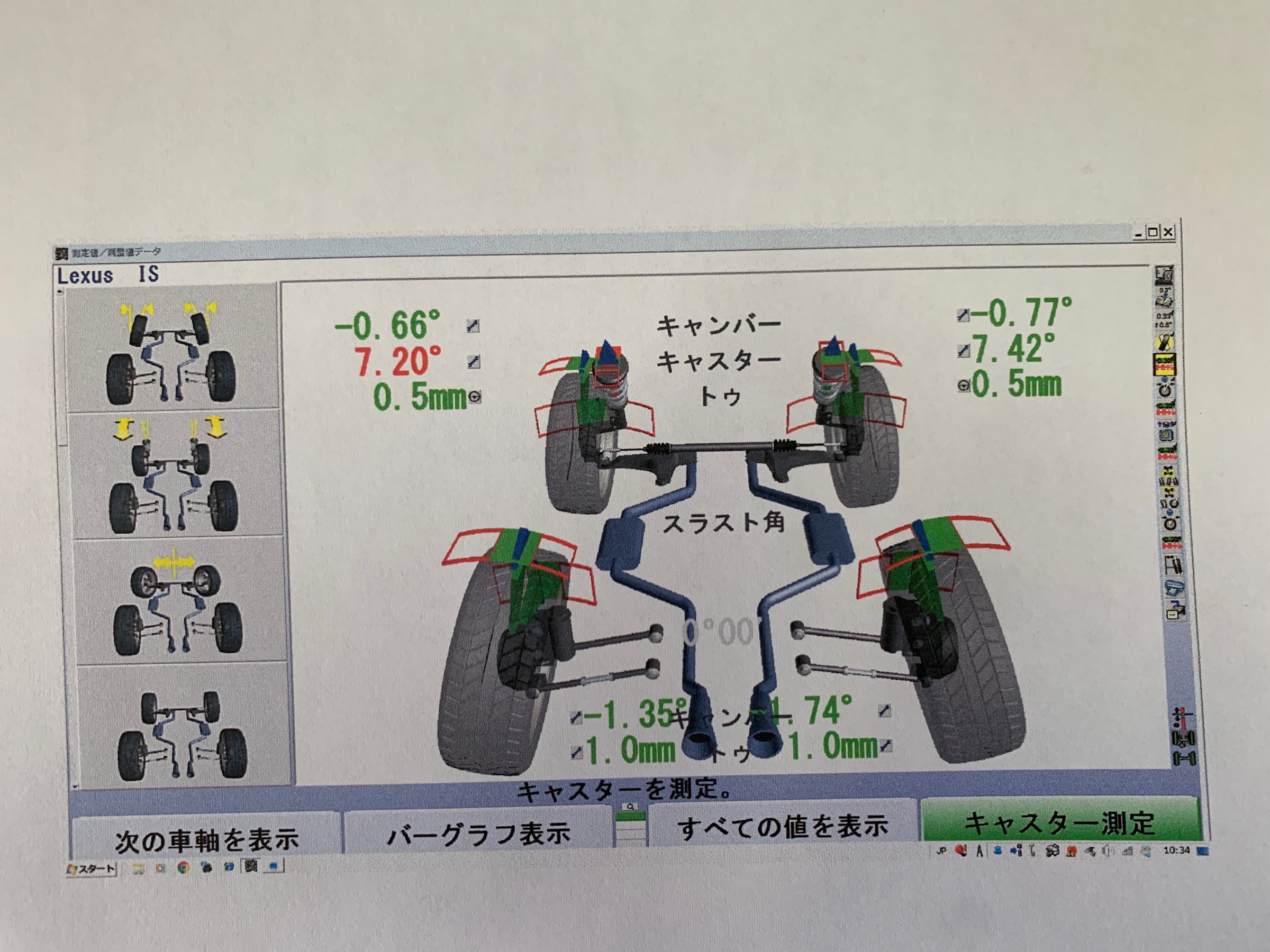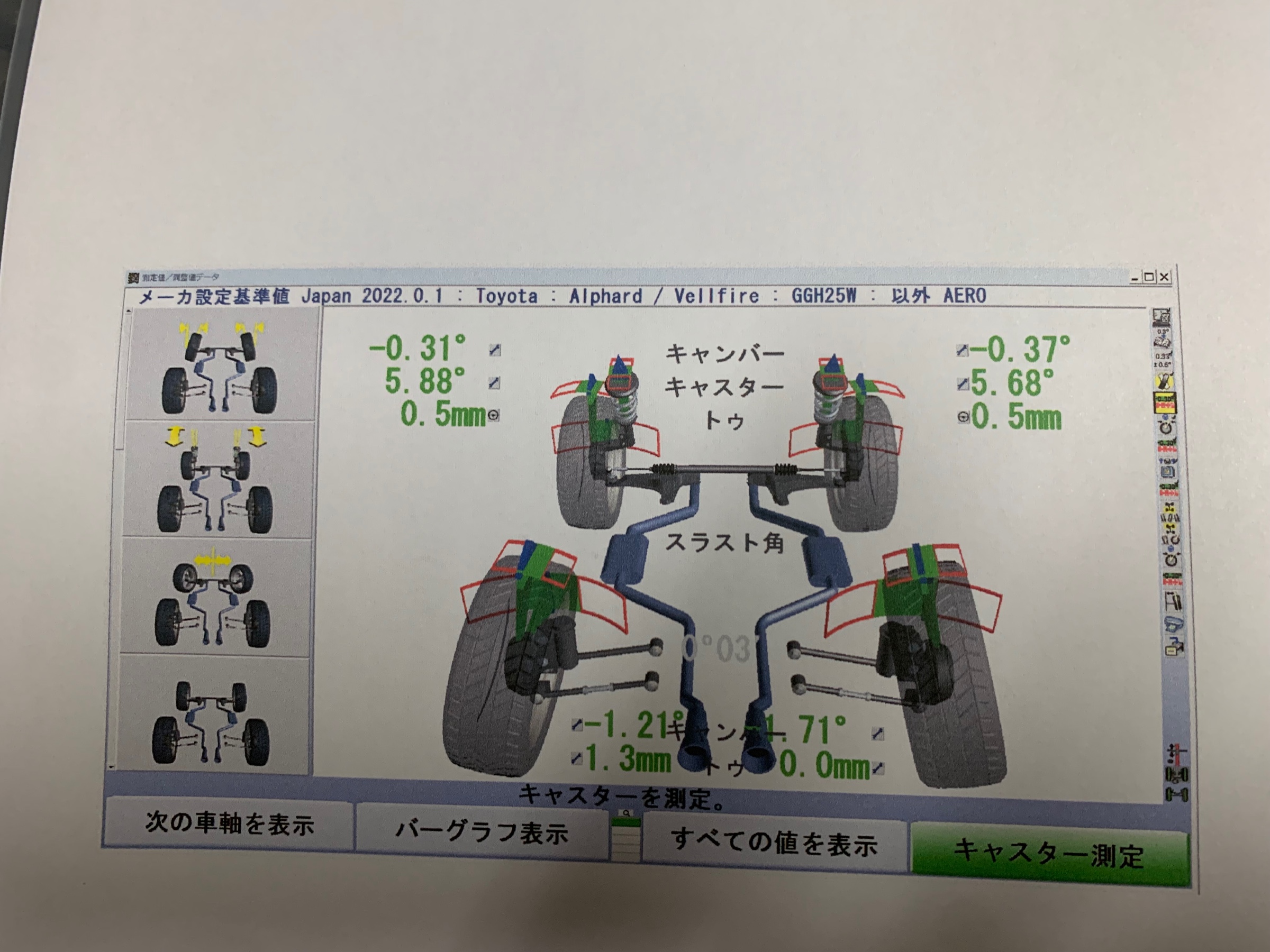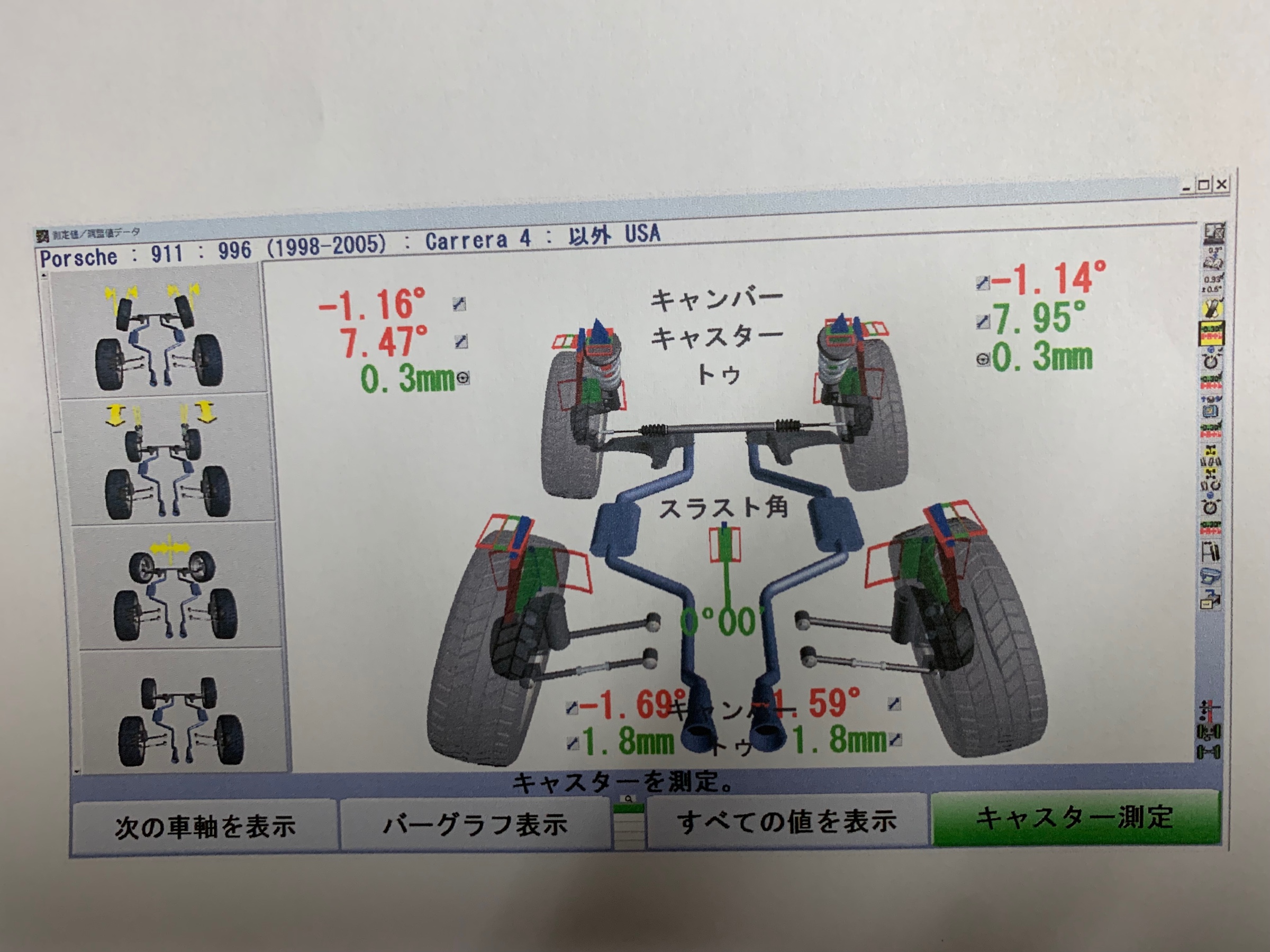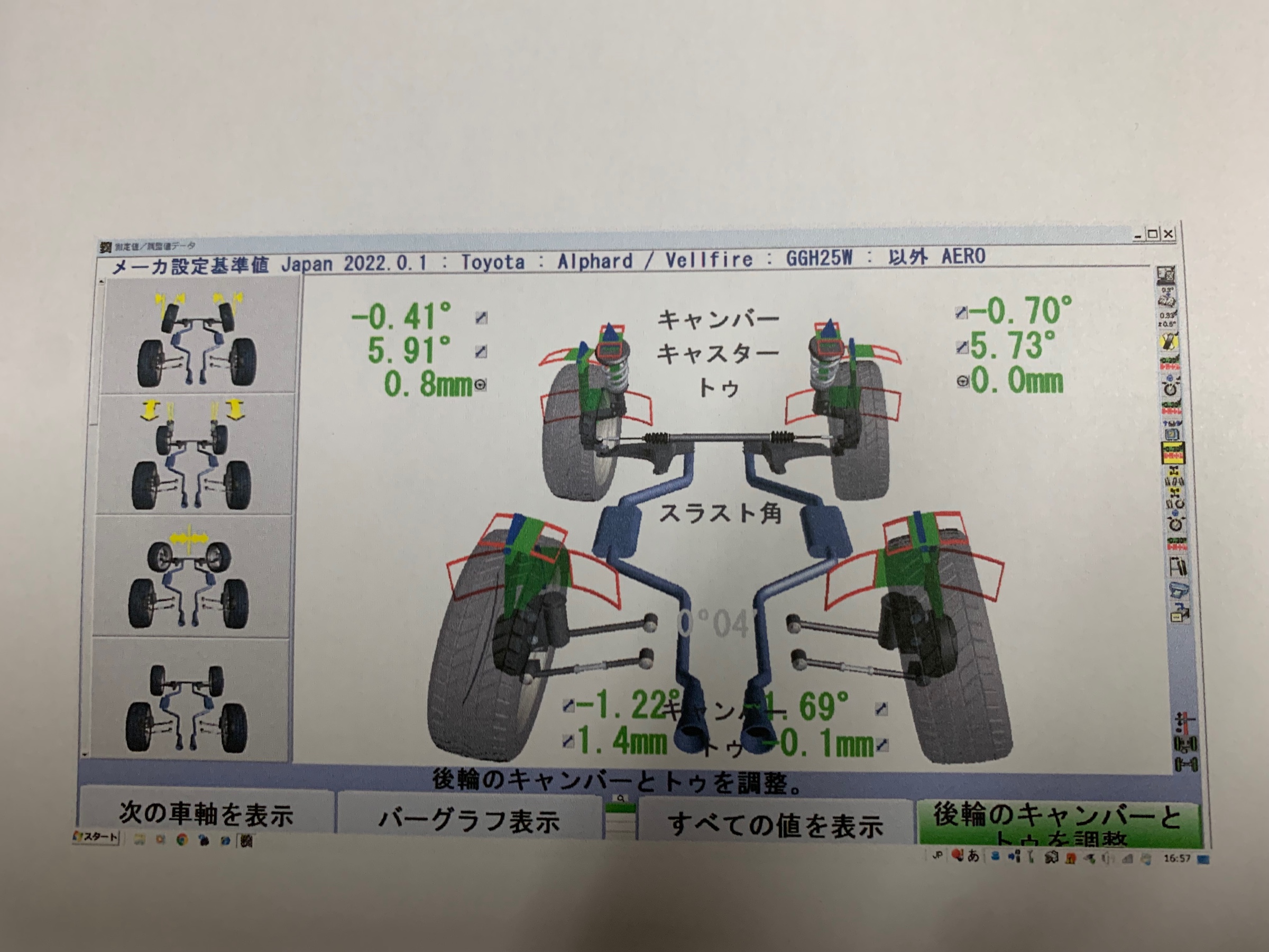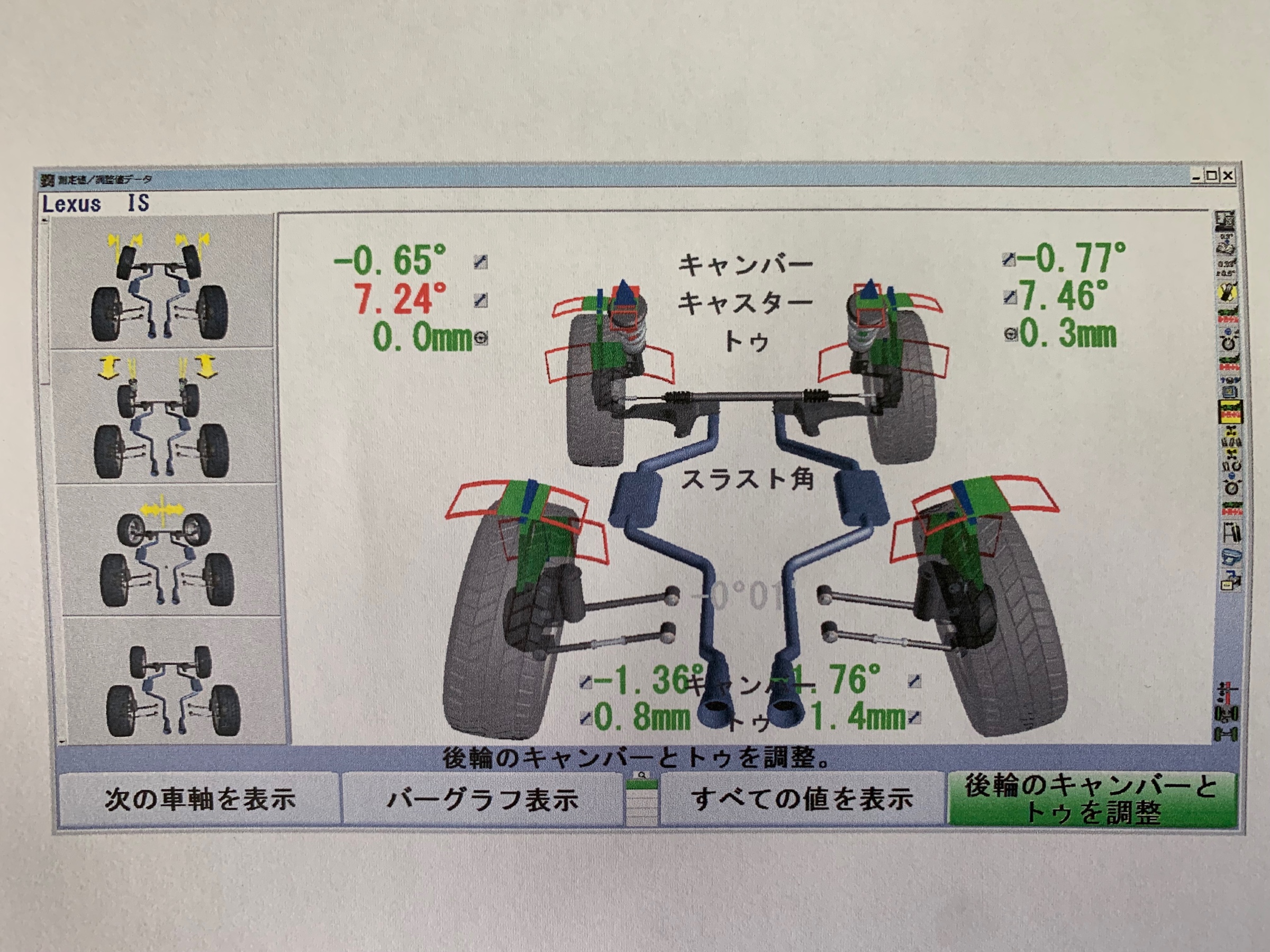 こちらは、リアは調整出来ませんのでフロントのキャンバーとトゥ調整をしました。