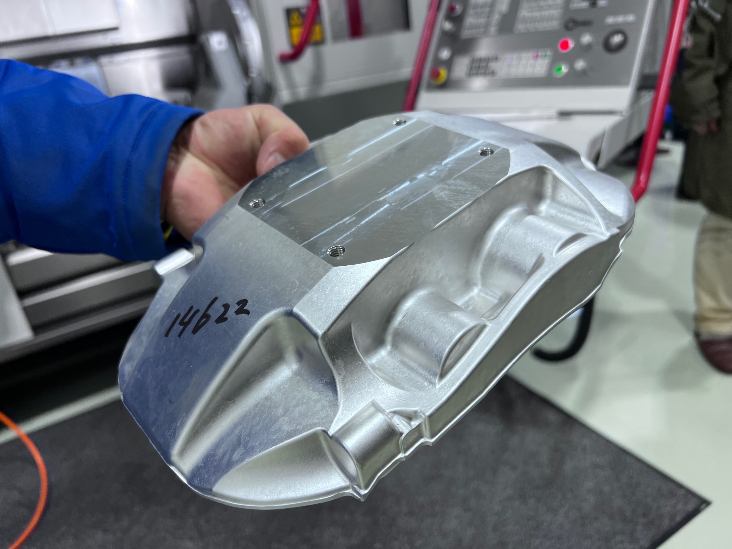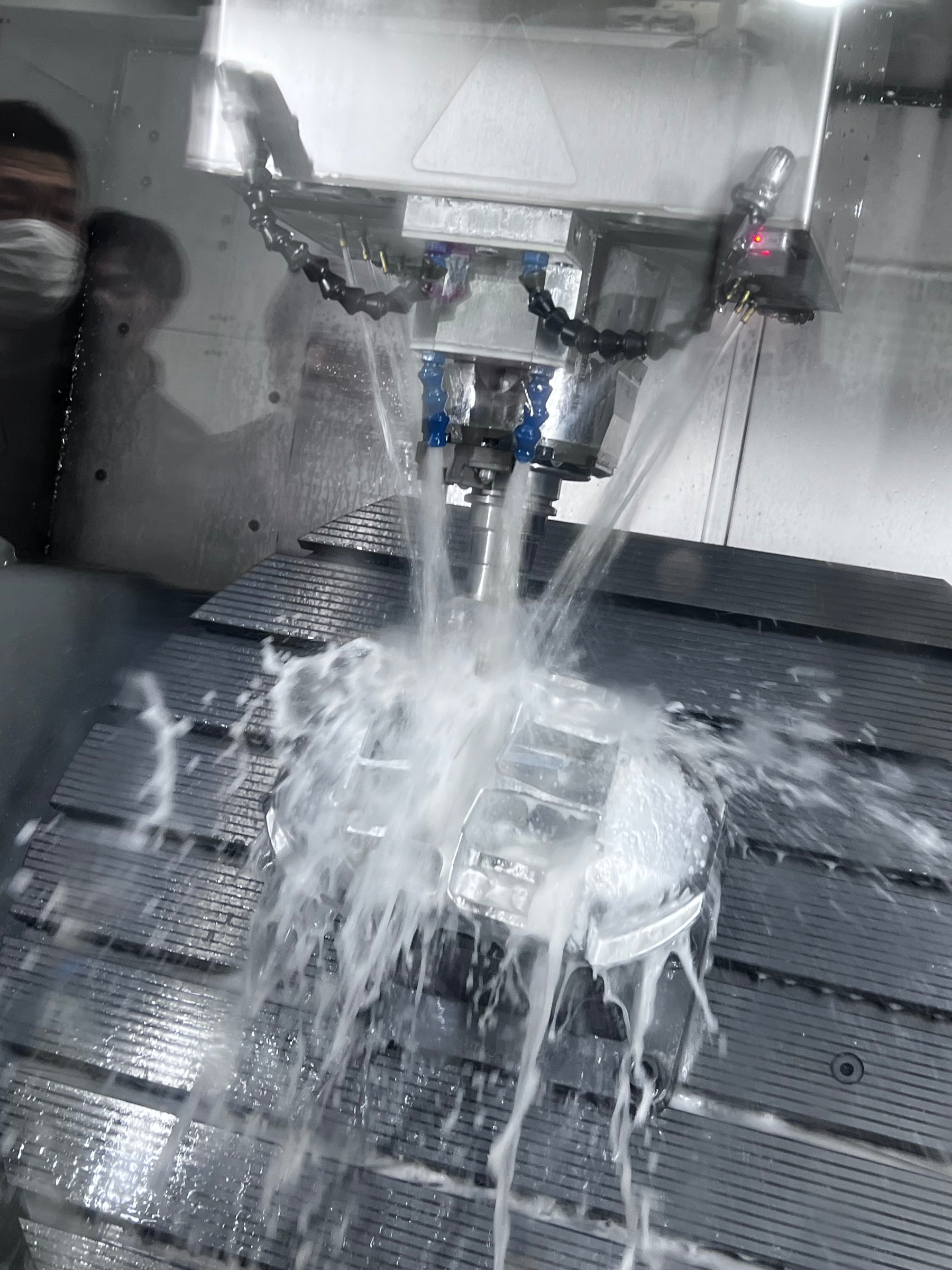 ドリルの先を勢いよく水で、冷却しながらマシンがキャリパーを削っていきます。