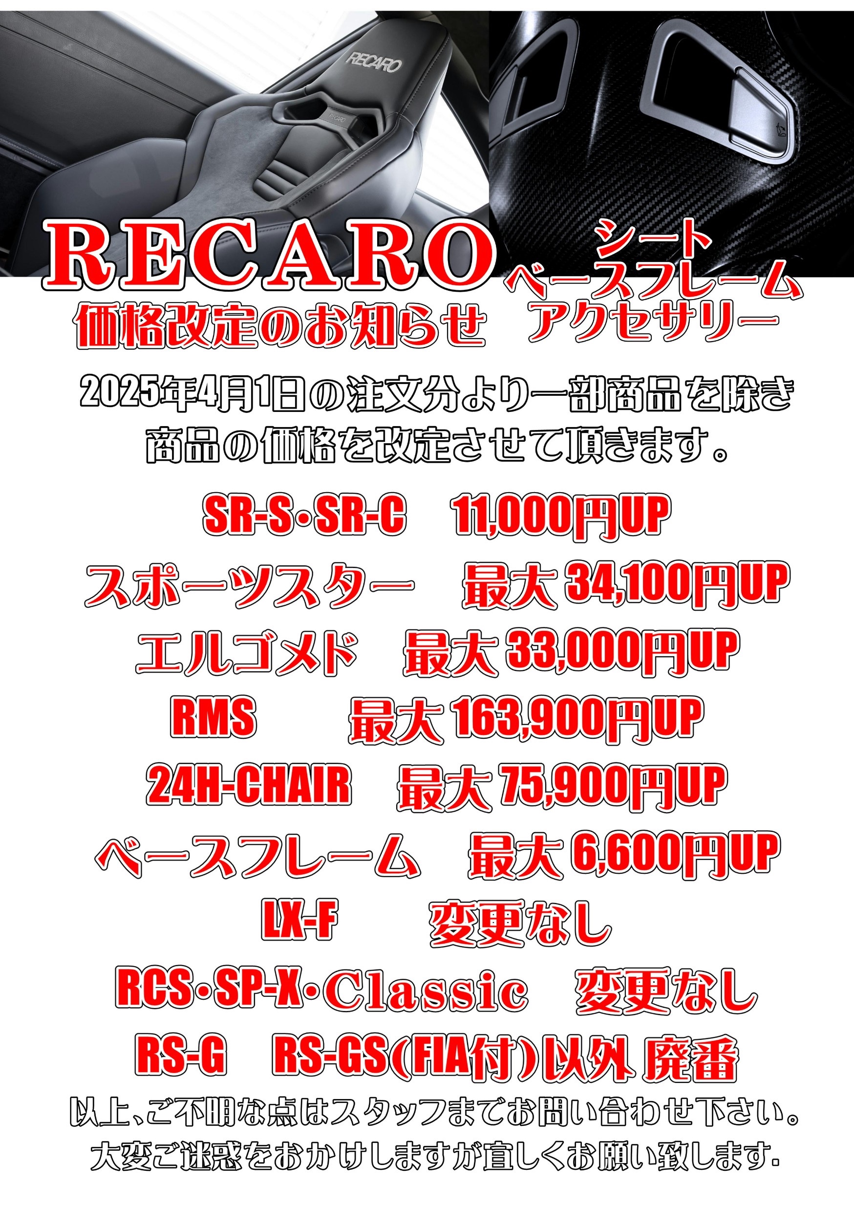 ⬇︎ ⬇︎ ⬇︎ RECAROシート価格改定のお知らせですm(_ _)m
