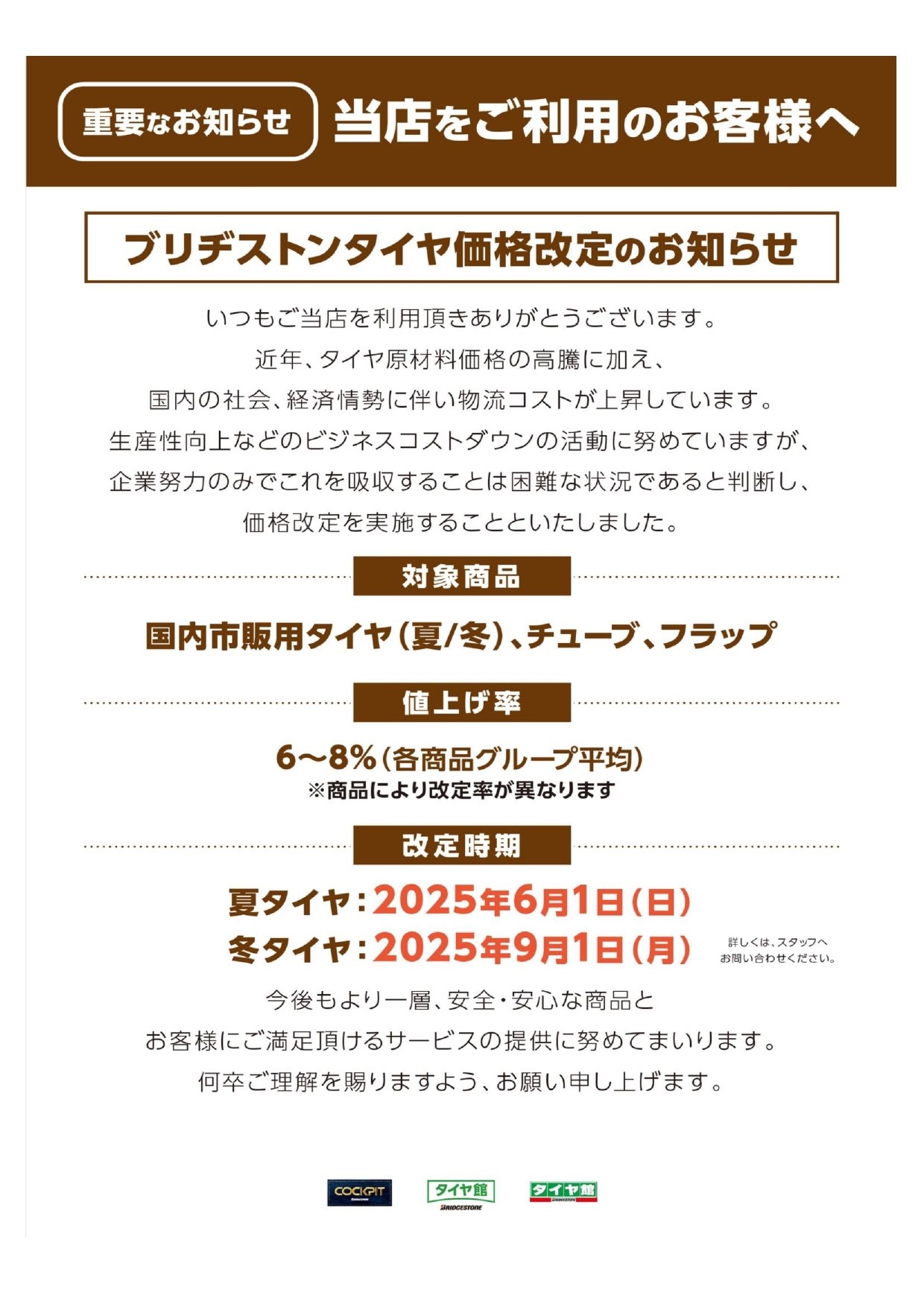 ⬇︎ 大変申し訳ありません。6月よりブリヂストン 夏タイヤが値上がりとなりますので